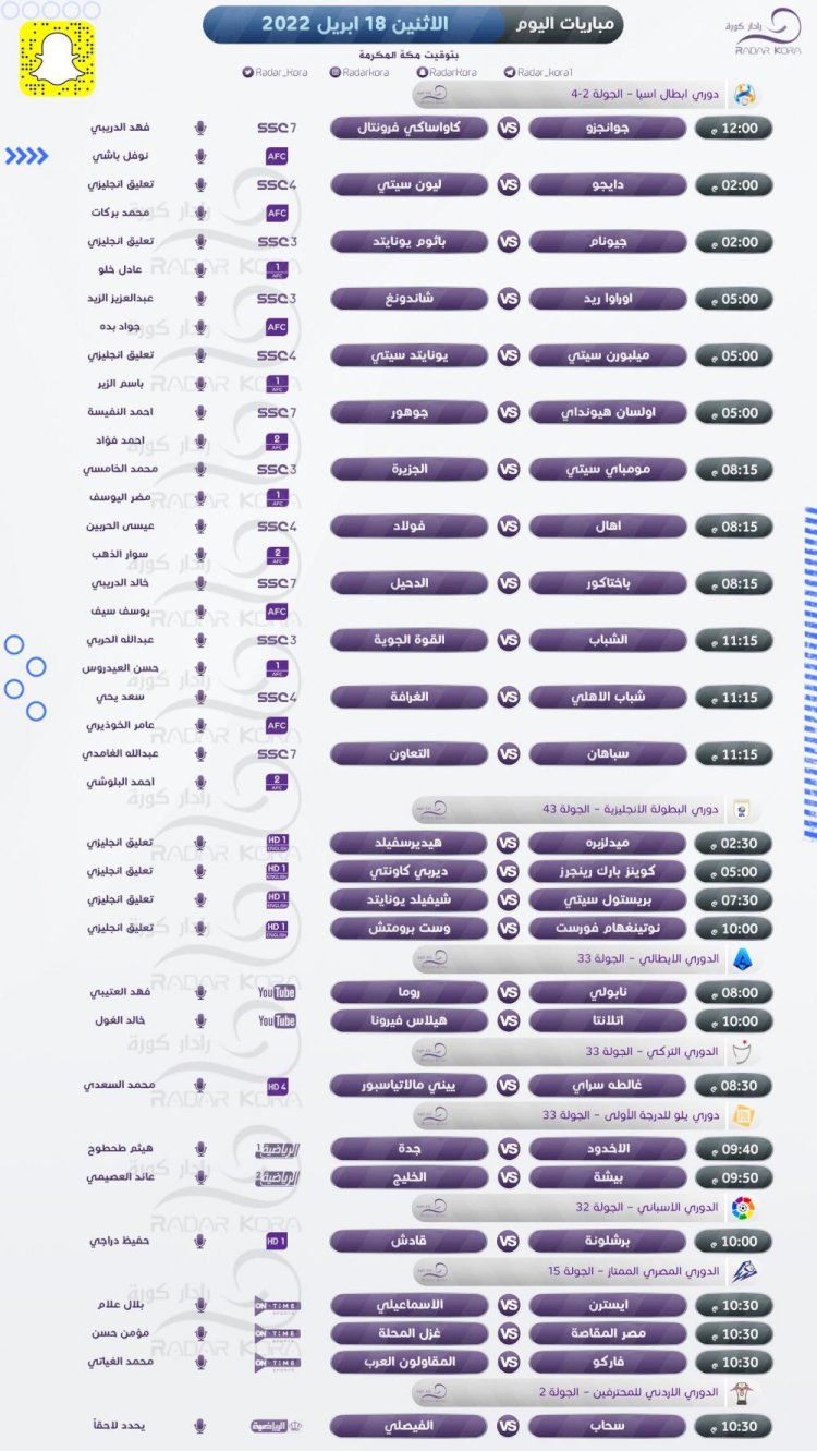 تتجه أنظار عشاق كرة القدم اليوم الاثنين لعدة مباريات في الدوريات المختلفة، ومرحلة المجموعات من أبطال أسيا.