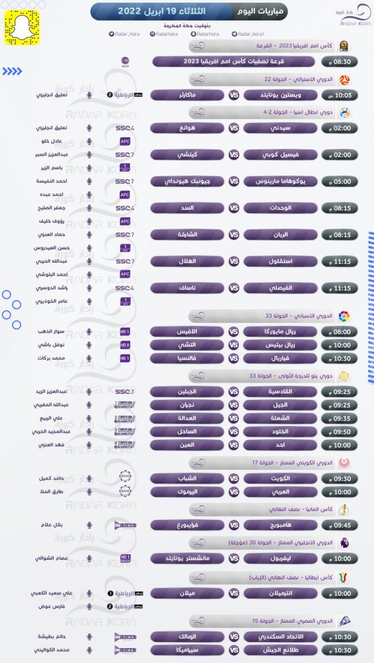 جدول أبرز مباريات الثلاثاء بالدوريات والكؤوس المختلفة