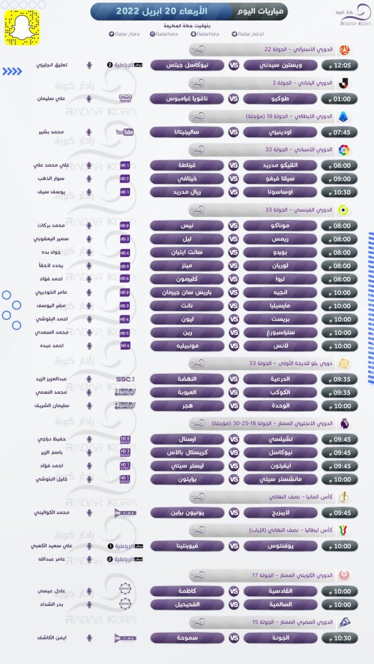 ويتقابل بإياب نصف نهائي كأس إيطاليا يوفنتوس مع فيورنتينا، وفي مباراة بارزة مؤجلة من الأسبوع 25 للدوري الإنجليزي الممتاز يلعب تشيلسي مع أرسنال، ويتقابل مانشستر سيتي مع برايتون بلقاء مؤجل من الجولة 30، أما في الدوري الإسباني يتواجه أوساسونا مع ريال مدريد، وأتلتيكو مدريد مع غرناطة ضمن مباريات المرحلة 33، وفي أبرز مباريات الأسبوع 33 من الدوري الفرنسي يتواجه أنجبه مع باريس سان جيرمان، ومارسيليا مع نانت.