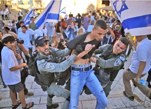 ووقعت مواجهات بين فلسطينيين وإسرائيليين أمس الأحد في نقاط مختلفة بالمدينة ومحيط المسجد الأقصى عند مرور مستوطنين يحملون أعلاما إسرائيلية ويغنون ويهتفون.