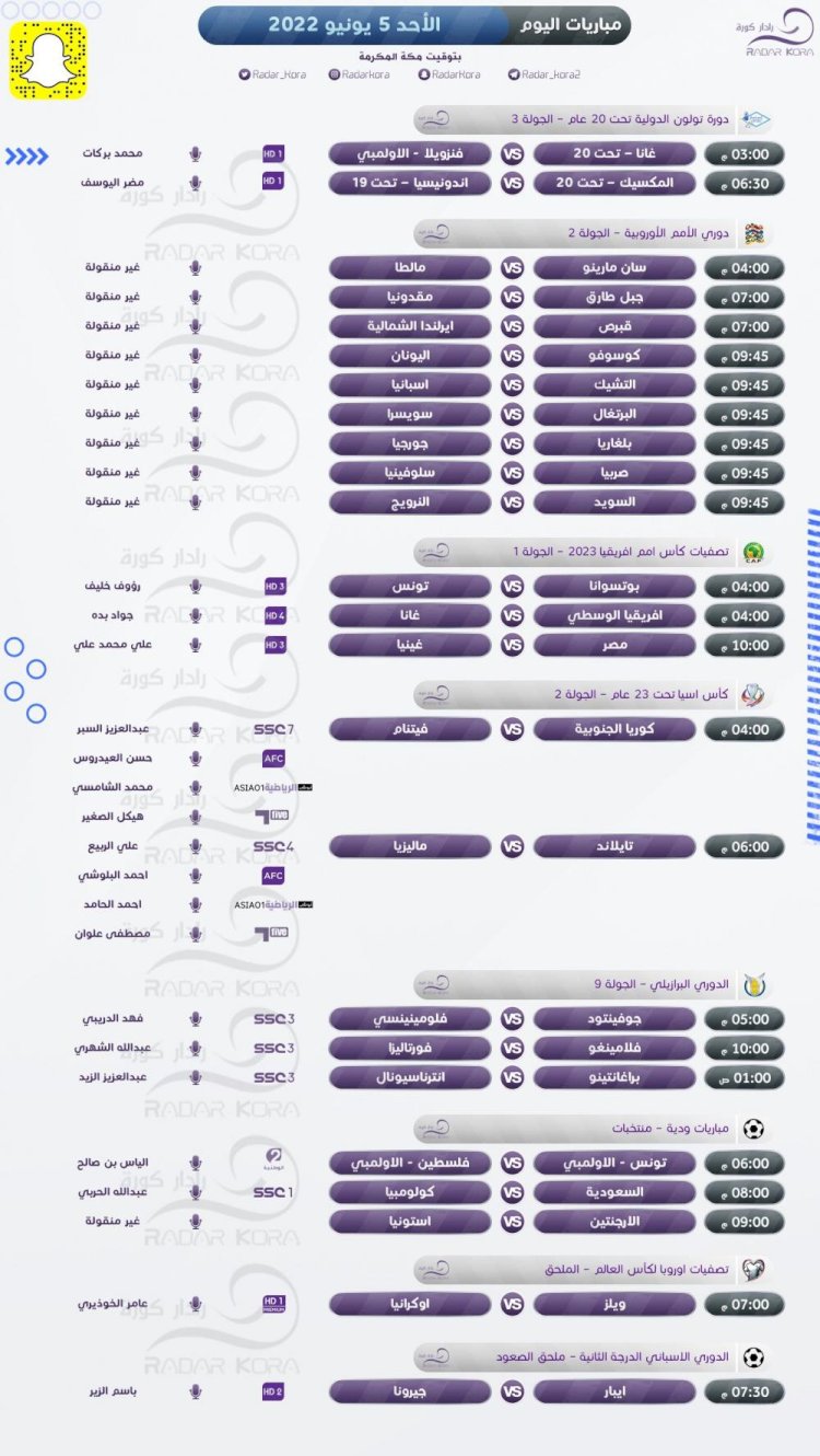 غزة - فتح ميديا:تتجه أنظار عشاق كرة القدم اليوم الأحد لمباريات عدة في بطولات عالمية للمنتخبات.