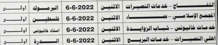 ويتقابل خدمات خانيونس مع شباب الزوايدة، والتفاح مع خدمات النصيرات، وأهلي النصيرات مع خدمات البريج، والمجمع الإسلامي مع نماء.