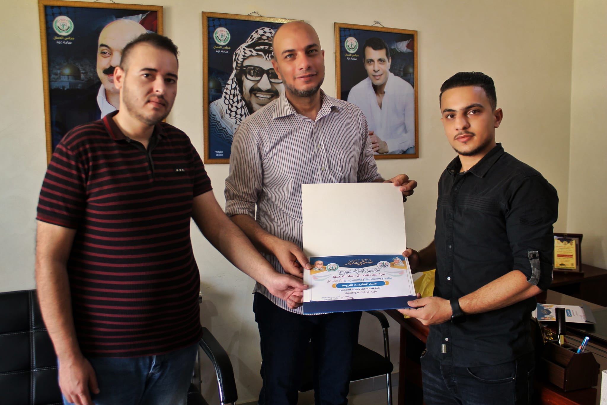 وأضاف :"أن هذا التكريم ياتي تثميناً للجهود التي يبذلوها في نقل الصورة الحقيقية و المساهمة في تغطية الفعاليات و أنشطة مجلس العمال ساحة غزة".