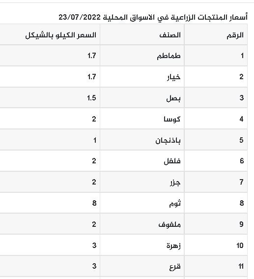 إليكم متوسط أسعار المنتجات الزراعية بالشيكل كما أعلنتها وزارة الزراعة في غزة اليوم السبت 12-7-2022