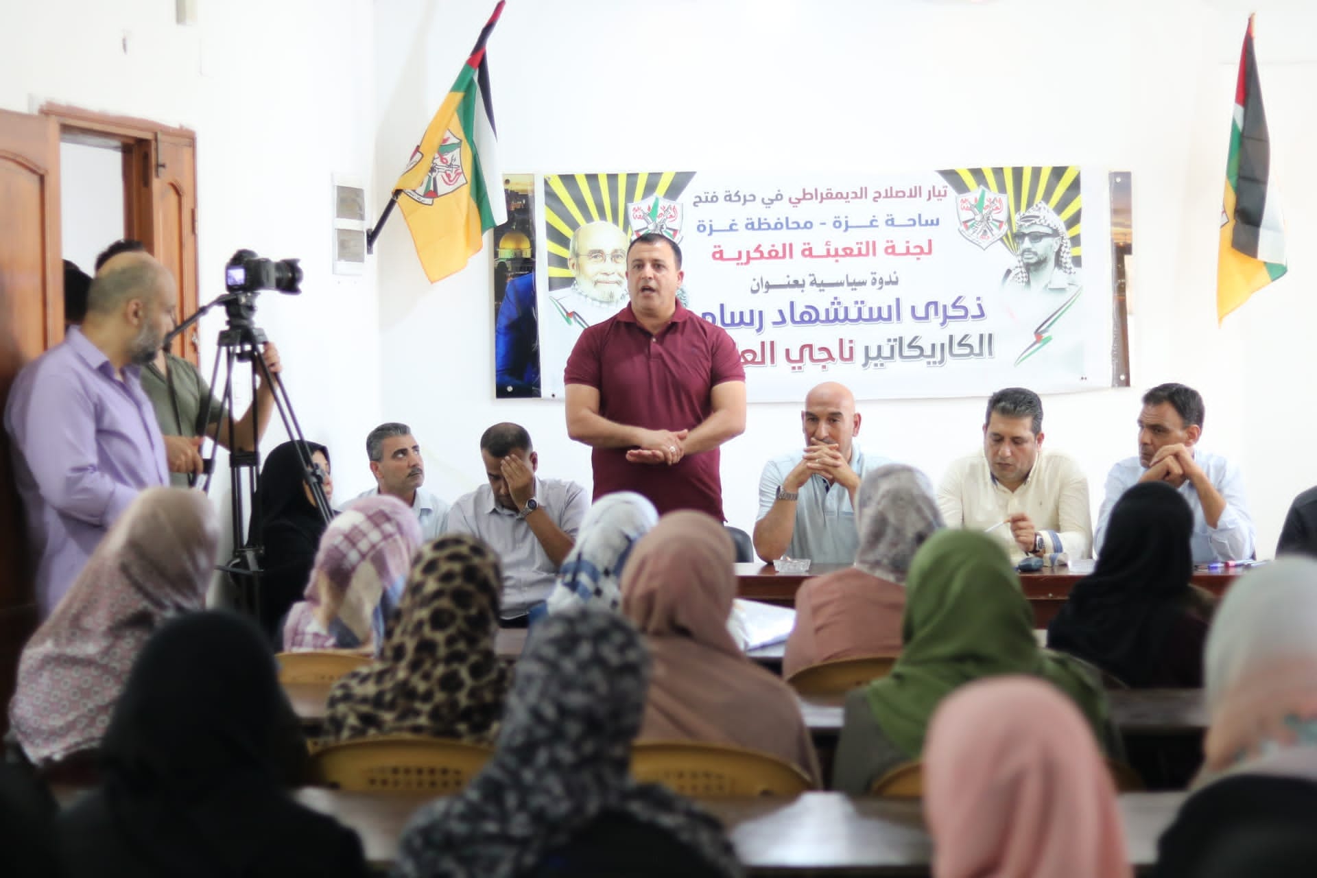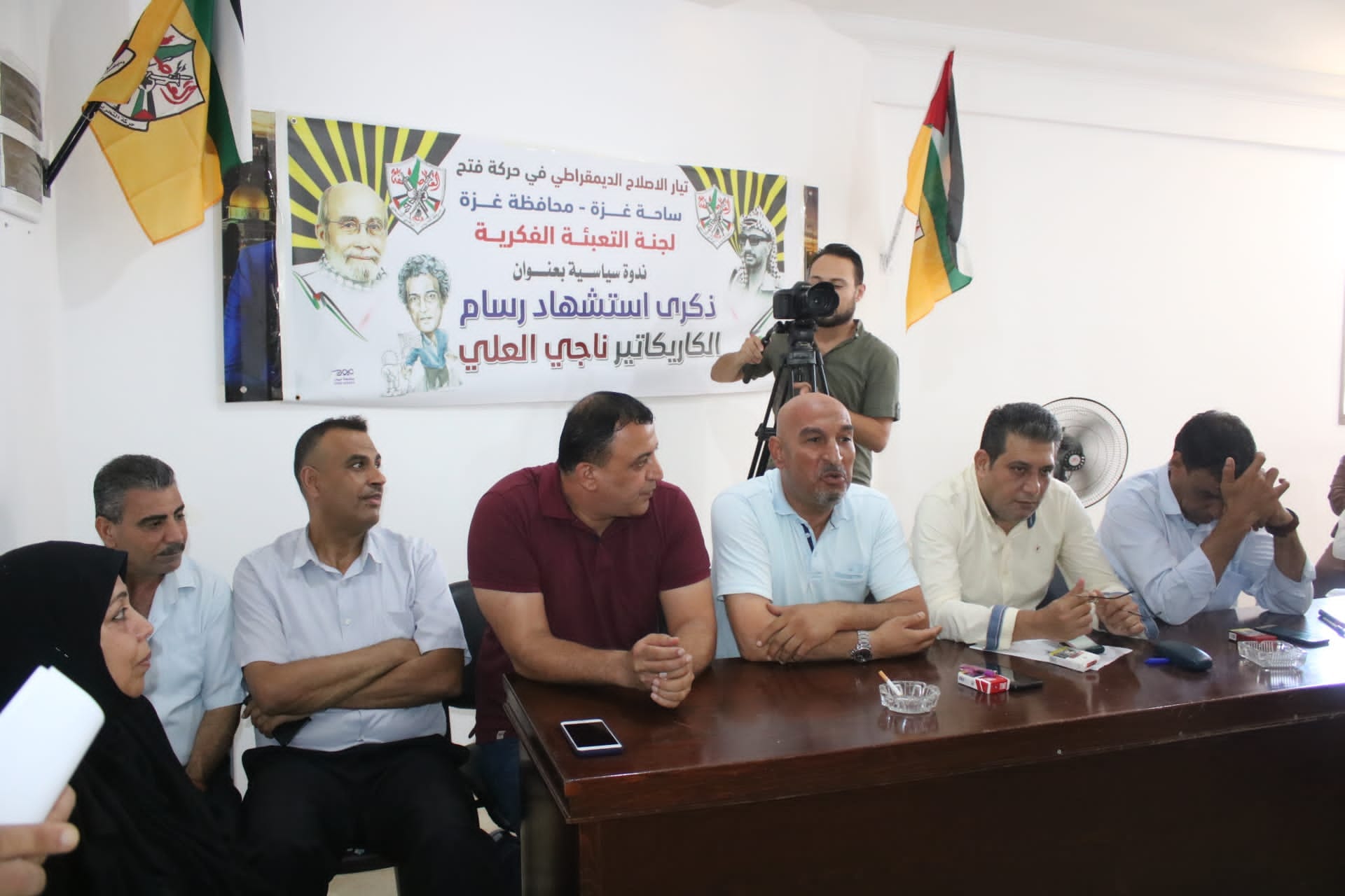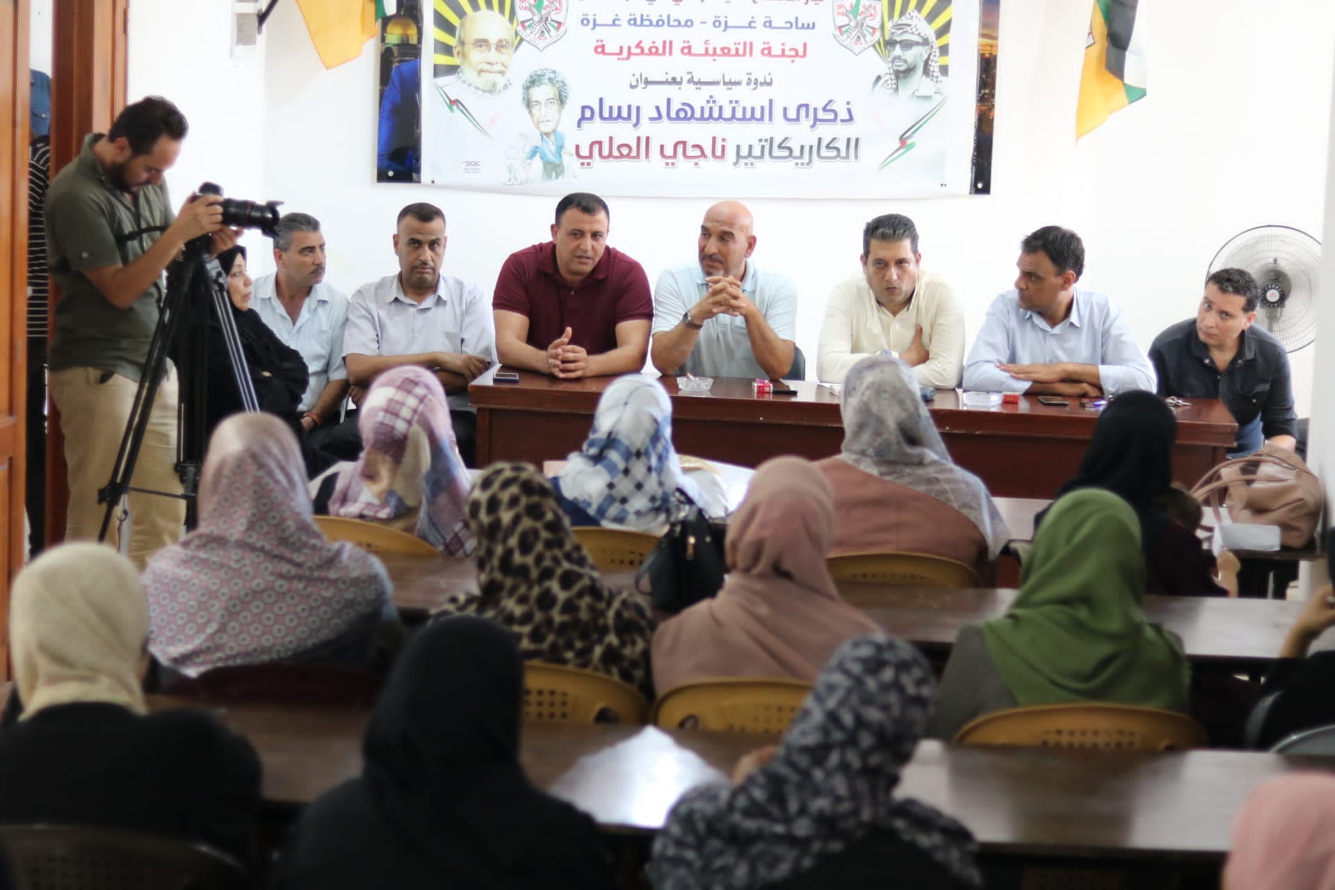 وتناولت الندوة التي نظمتها لجنة التعبئة الفكرية بحركة فتح في محافظة غزة، الحديث عن مناقب الراحل ناجي العلي، وذلك بمشاركة أمين سر لجنة التعبئة الفكرية في ساحة غزة أحمد نصر.