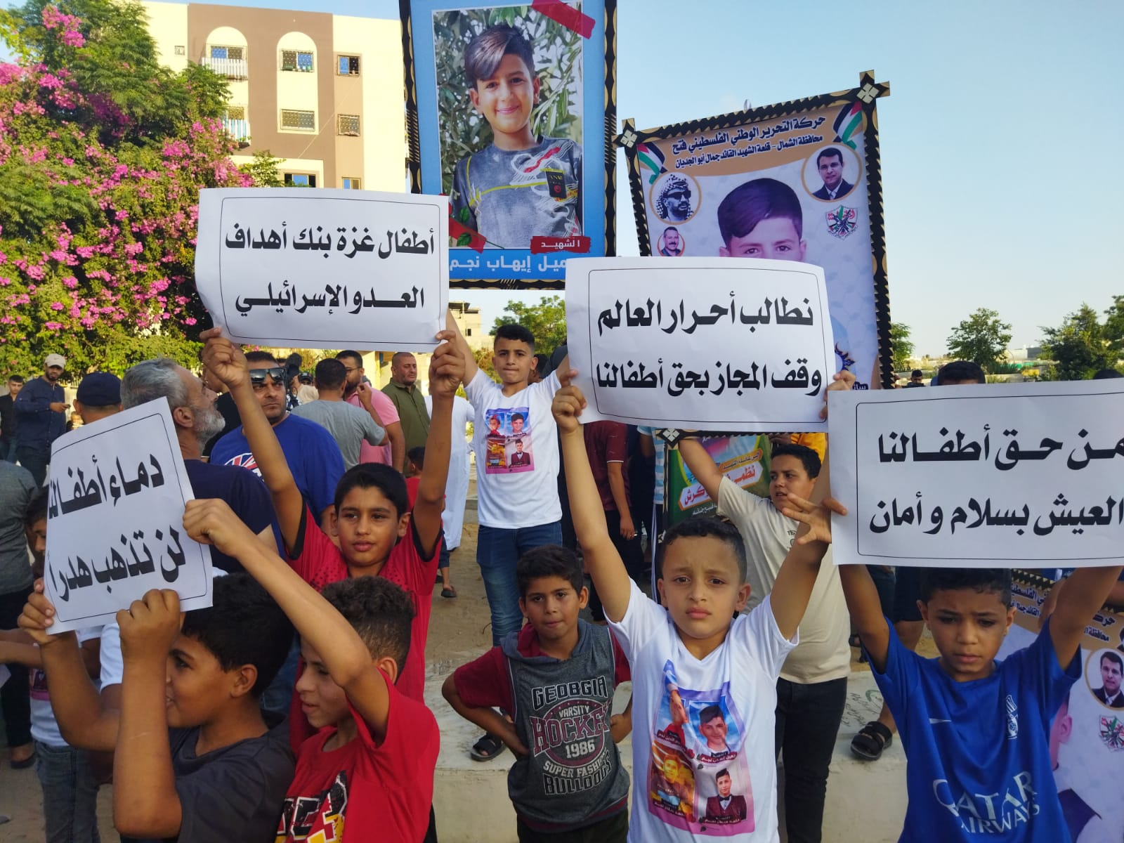 نظم أطفال ومواطنون من غزة، اليوم الثلاثاء، وقفة احتجاجية في مخيم جباليا شمال القطاع، تنديدًا بجريمة استهداف الأطفال من طائرات الاحتلال خلال العدوان الأخير.