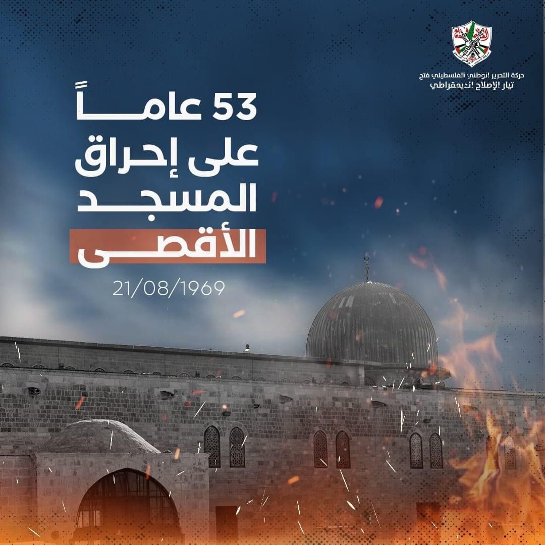 يصادف اليوم 21 أغسطس 2022 الذكرى الــ 53 على إحراق المسجد الأقصى، تلك الجريمة المدبرة التي ارتكبها اليهودي مايكل دينس روهن، بعد أن جاء الى فلسطين تحت ستار السياحة وأقدم على إشعال النار في الجامع القبْلي في المسجد الاقصى، حيث التهمت النيران عدد من المعالم الاثرية والدينية، واستطاع الفلسطينيون إنقاذ بقية الجامع من أن تأكله النار.