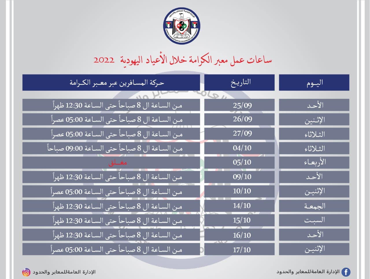 وفيما يلي جدول ساعات عمل معبر الكرامة خلال شهري سبتمبر – أكتوبر: