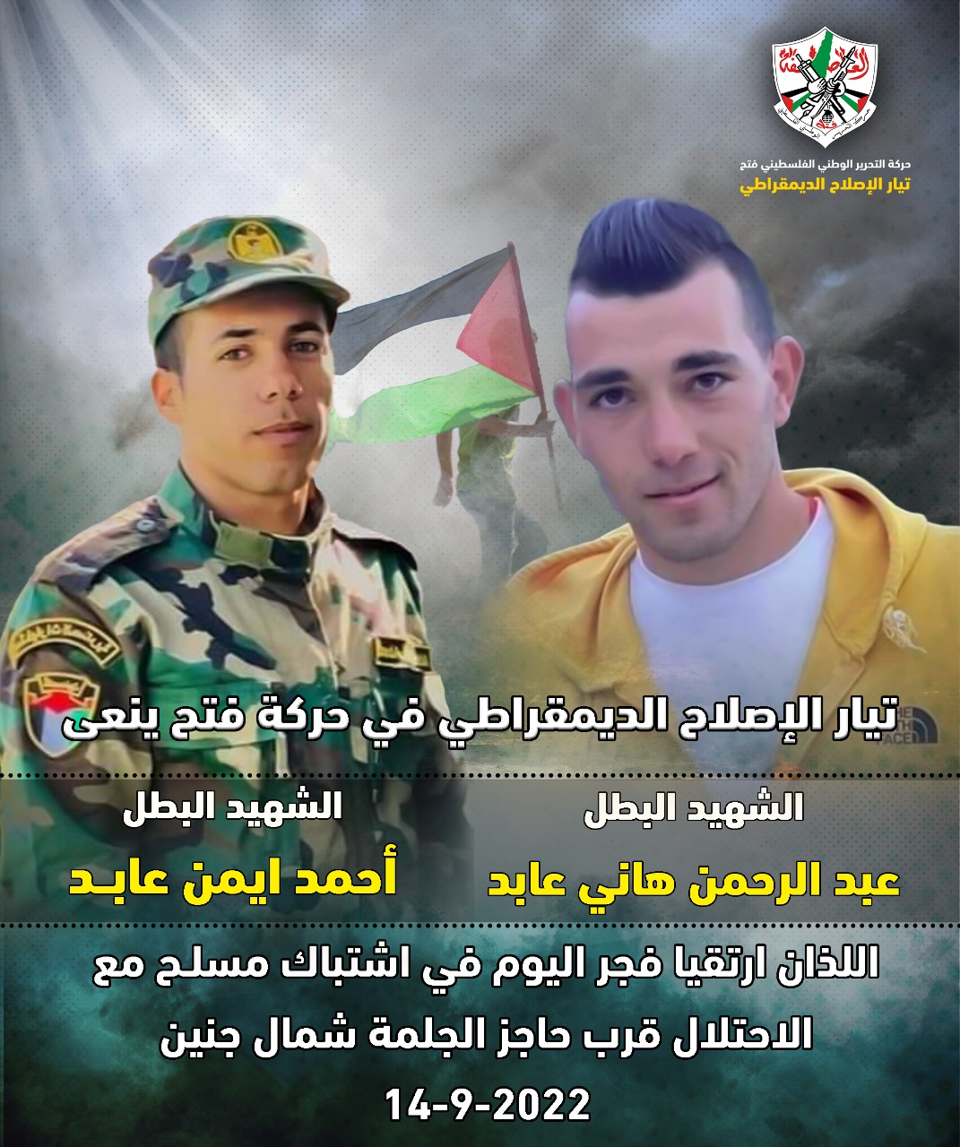 نعى تيار الإصلاح الديمقراطي في حركة فتح الشهيدين احمد ايمن ابراهيم عابد (23 عاما)، وعبد الرحمن هاني صبحي عابد (22 عاما.، استشهدا برصاص قوات الاحتلال بالقرب من حاجز الجلمة العسكري شمال جنين.
