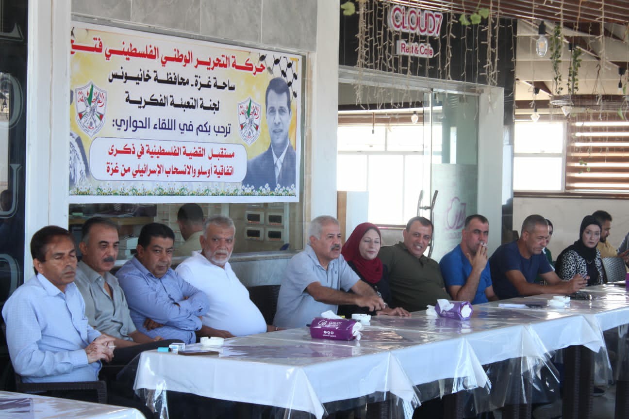 نظمت لجنة التعبئة الفكرية في حركة فتح بساحة غزة أولى سلسلة اللقاءات الحوارية في محافظة خان يونس، والتي تستهدف جميع محافظات قطاع غزة، بعنوان "مستقبل القضية الفلسطينية في ذكرى توقيع اتفاقية أوسلو، والانسحاب الإسرائيلي من قطاع غزة"، بحضور أحمد نصر أمين سر لجنة التعبئة الفكرية في ساحة غزة، وقيادة ساحة غزة، وجميع المكونات التنظيمية في المحافظة.