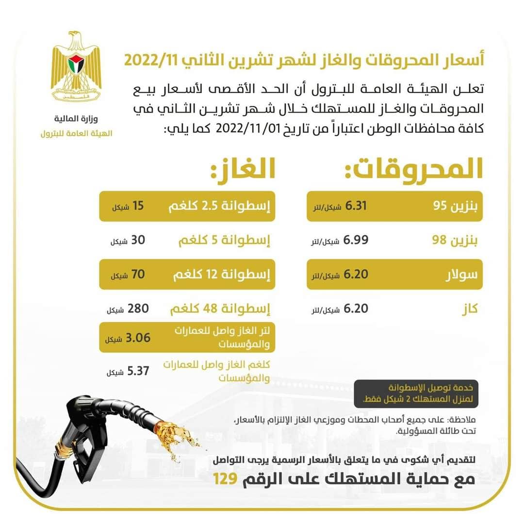 "المالية برام الله" تعلن أسعار المحروقات والغاز لشهر نوفمبر