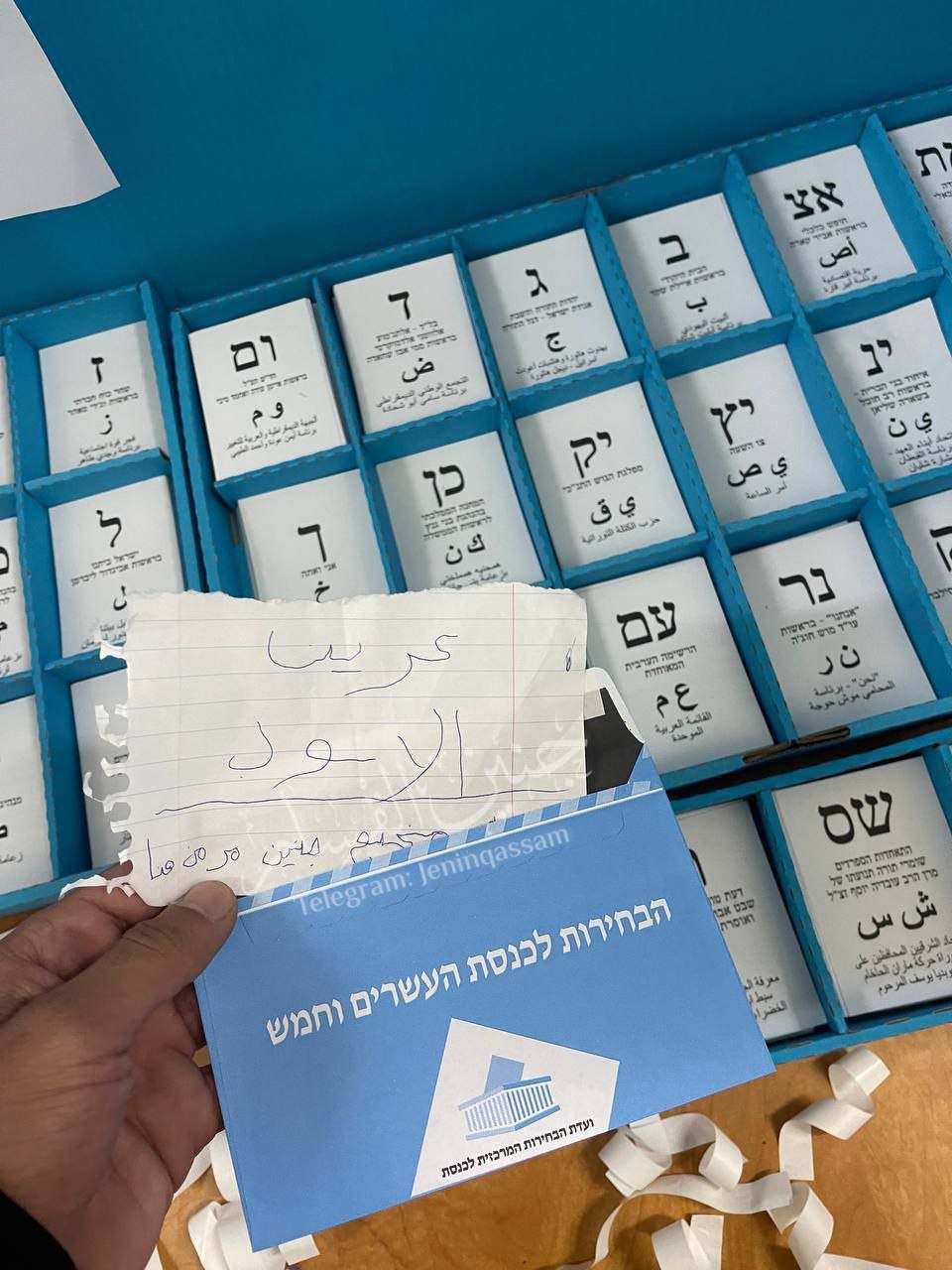 انتشرت عبر مواقع التواصل الإجتماعي، مساء اليوم الثلاثاء، صورة لأحد المقترعين في انتخابات "الكنيست الإسرائيلية" وترك رسالة ورقية في كبينة الانتخاب مكتوب عليها "عرين الأسود ومخيم جنين مر من هنا".