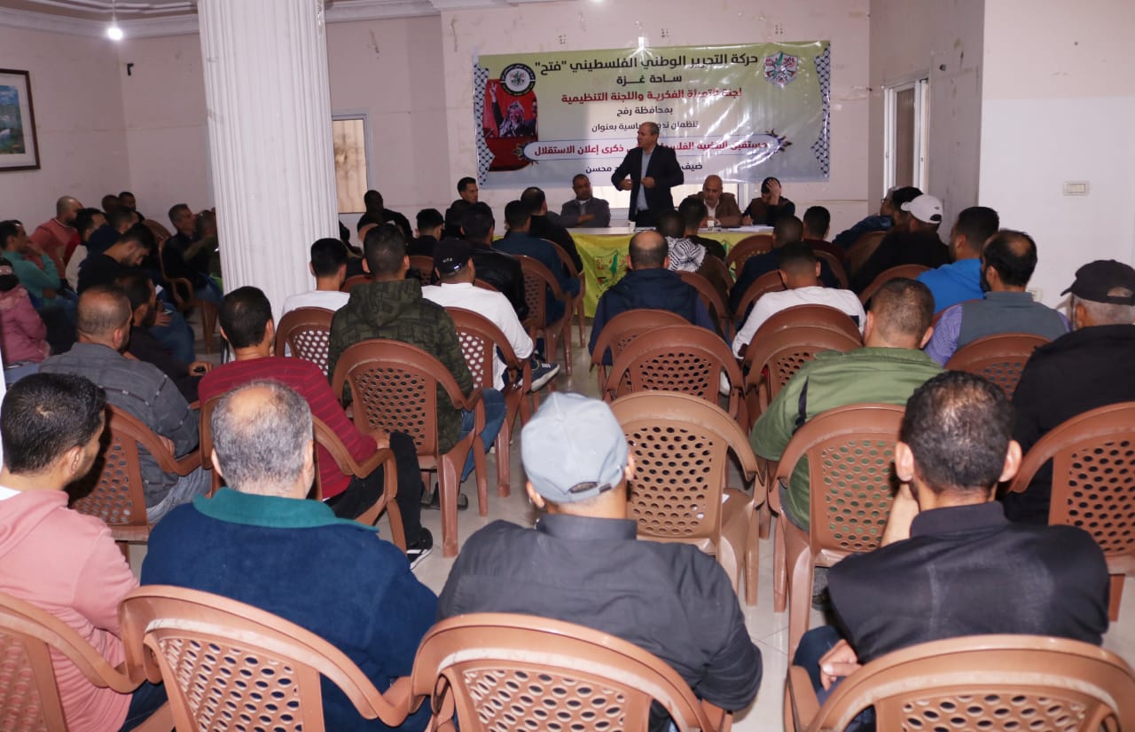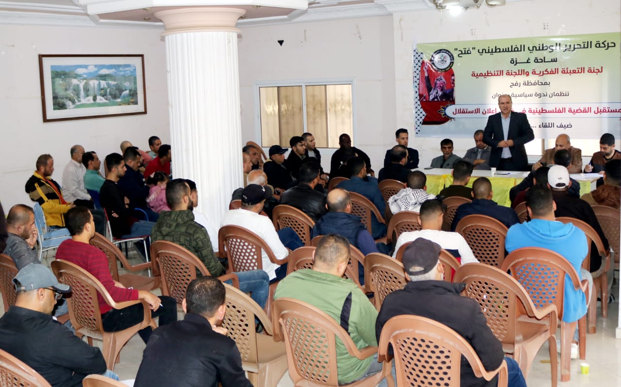 نظمت لجنة التعبئة الفكرية واللجنة التنظيمية بحركة فتح في محافظة رفح، اليوم الأربعاء، ندوة سياسية بعنوان "مستقبل القضية الفلسطينية في ذكرى الاستقلال"، وذلك إحياءً لذكرى إعلان الاستقلال الرابع والثلاثين، وتأكيداً على الثوابت الوطنية.