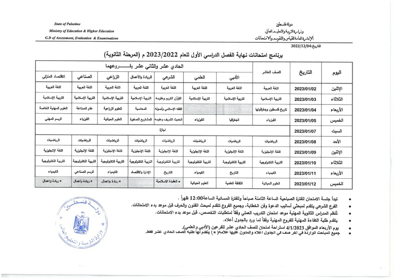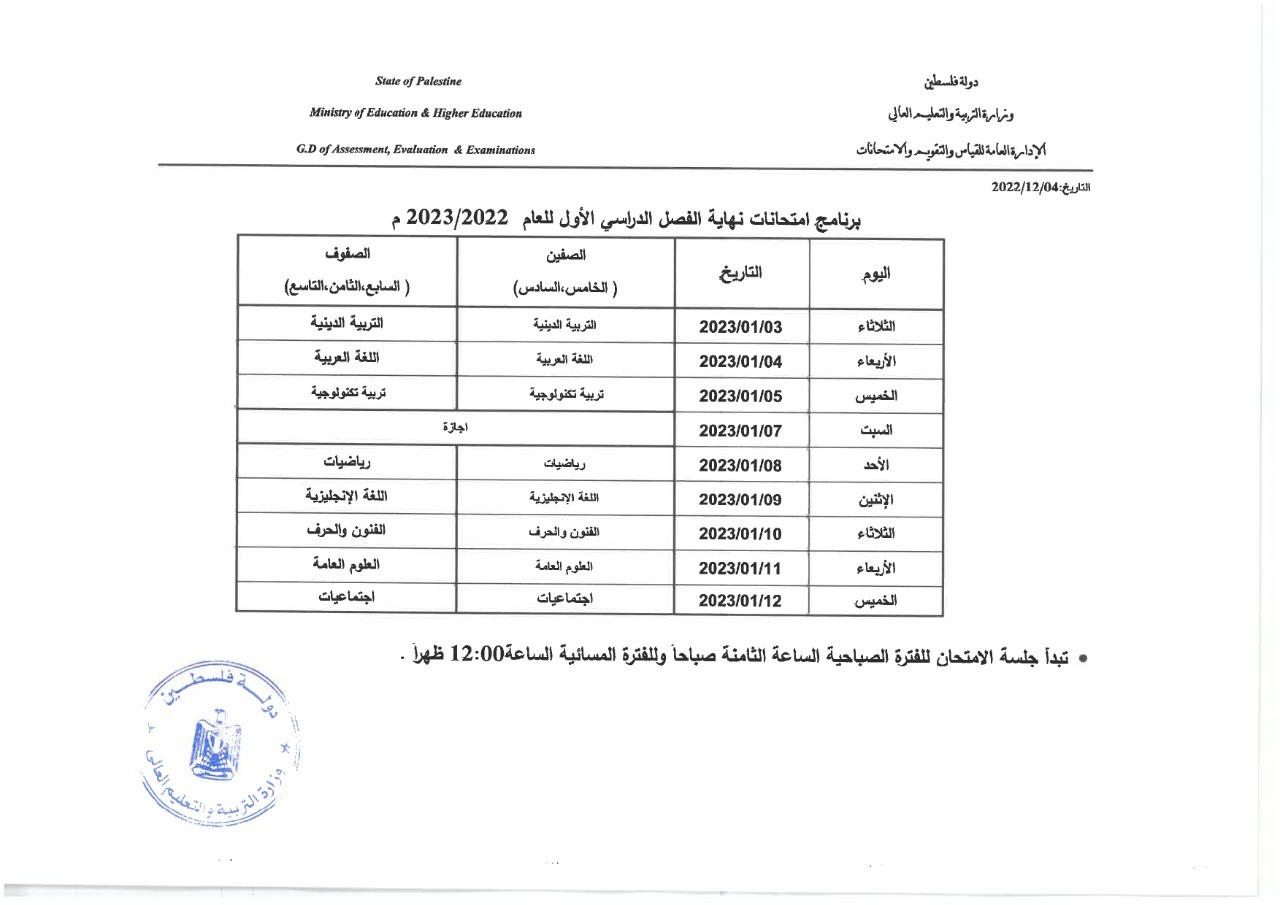 نشرت وزارة التربية والتعليم العالي- الإدارة العامة للقياس والتقويم والامتحانات جدول امتحانات نهاية الفصل الدراسي الأول للعام 2022-2023