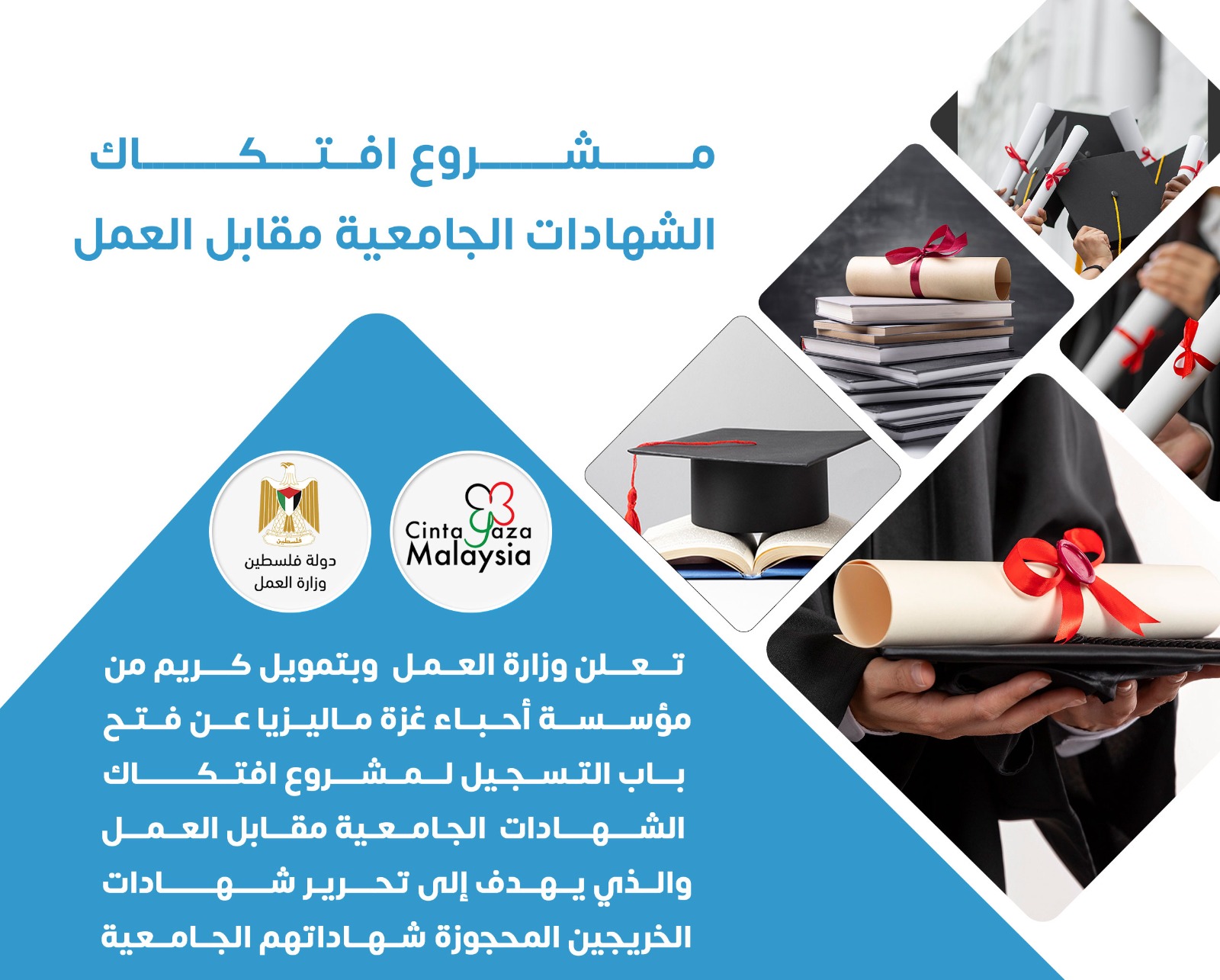 أعلنت وزارة العمل في قطاع غزة اليوم الخميس، عن فتح باب التسجيل في مشروع افتكاك الشهادات الجامعية مقابل العمل (المرحلة الثانية) بتمويل من مؤسسة أمان فلسطين ماليزيا.