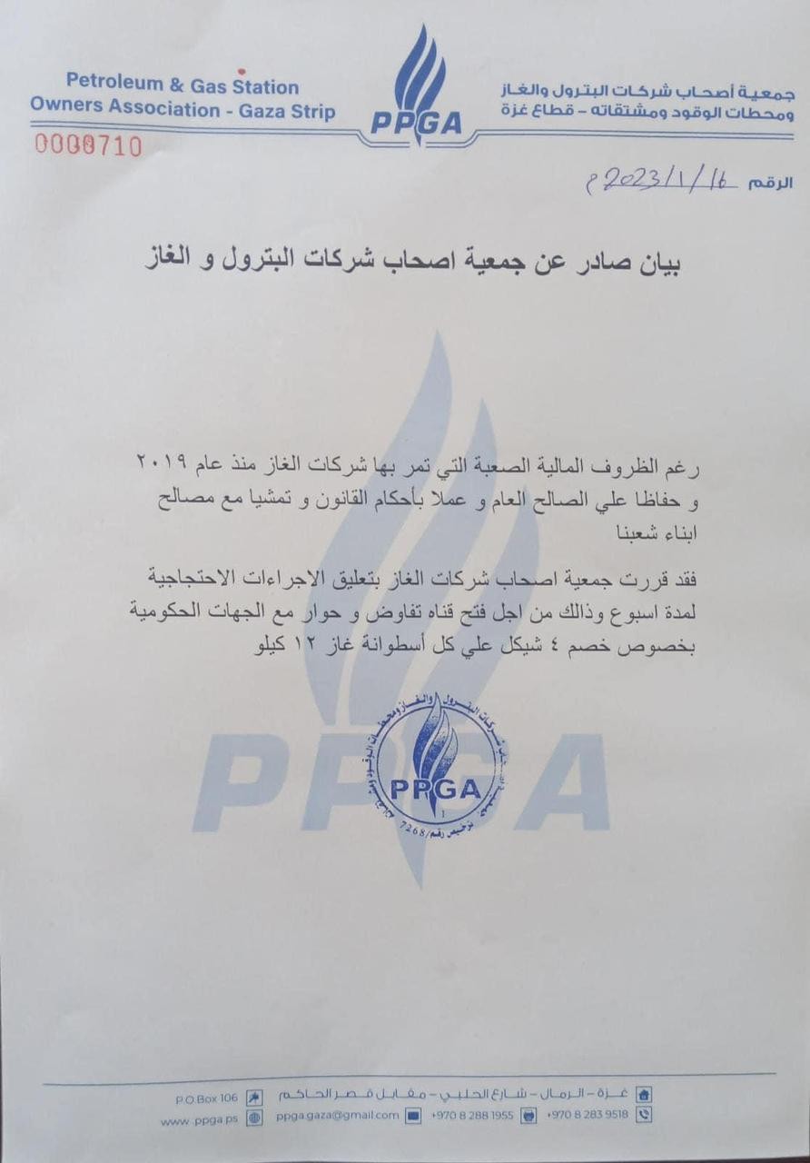 أصدرت جمعية أصحاب شركات الغاز والبترول في قطاع غزة ، يوم الثلاثاء 17 يناير 2023، بيانًا بشأن الإجراءات الاحتجاجية.