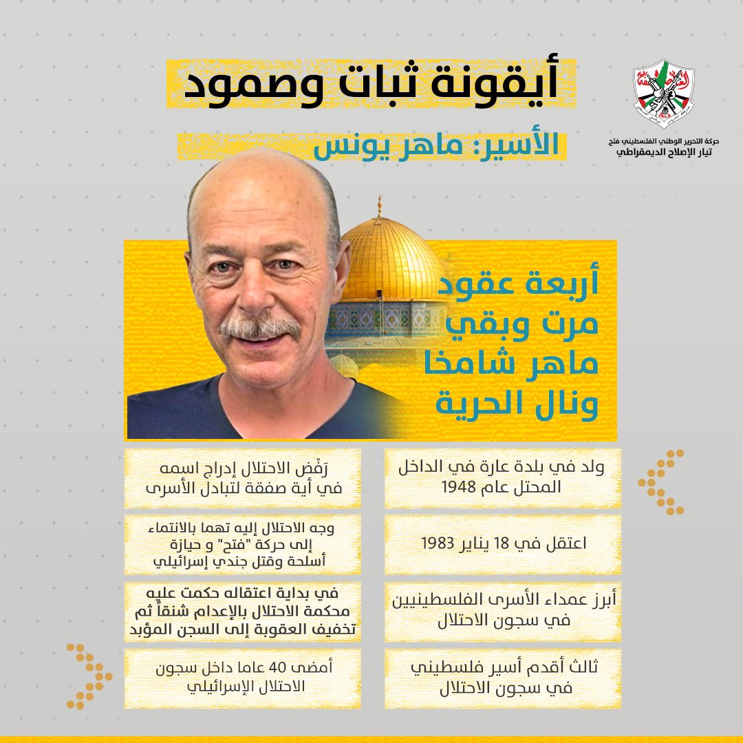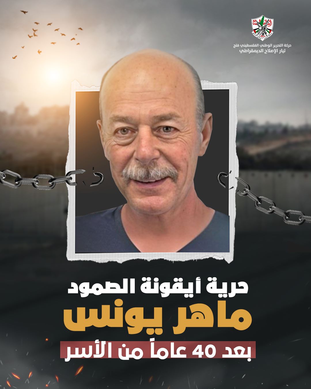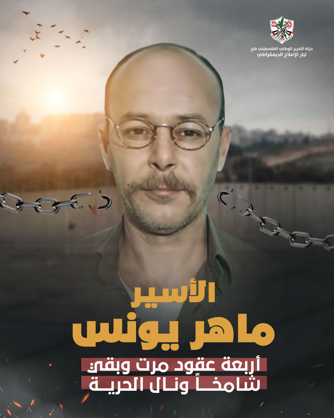 تقدم تيار الإصلاح الديمقراطي في حركة فتح بأحر التهاني لجماهير شعبنا وأهلنا في الداخل وأبناء بلدة (عارة) الأبطال ، بمناسبة اطلاق سراح المناضل الأسير ماهر يونس، بعد أربعة عقودٍ أمضاها بالتمام والكمال في سجون الاحتلال، كان فيها عميدًا لأسرى الحرية من أبناء شعبنا ولكل أحرار العالم.