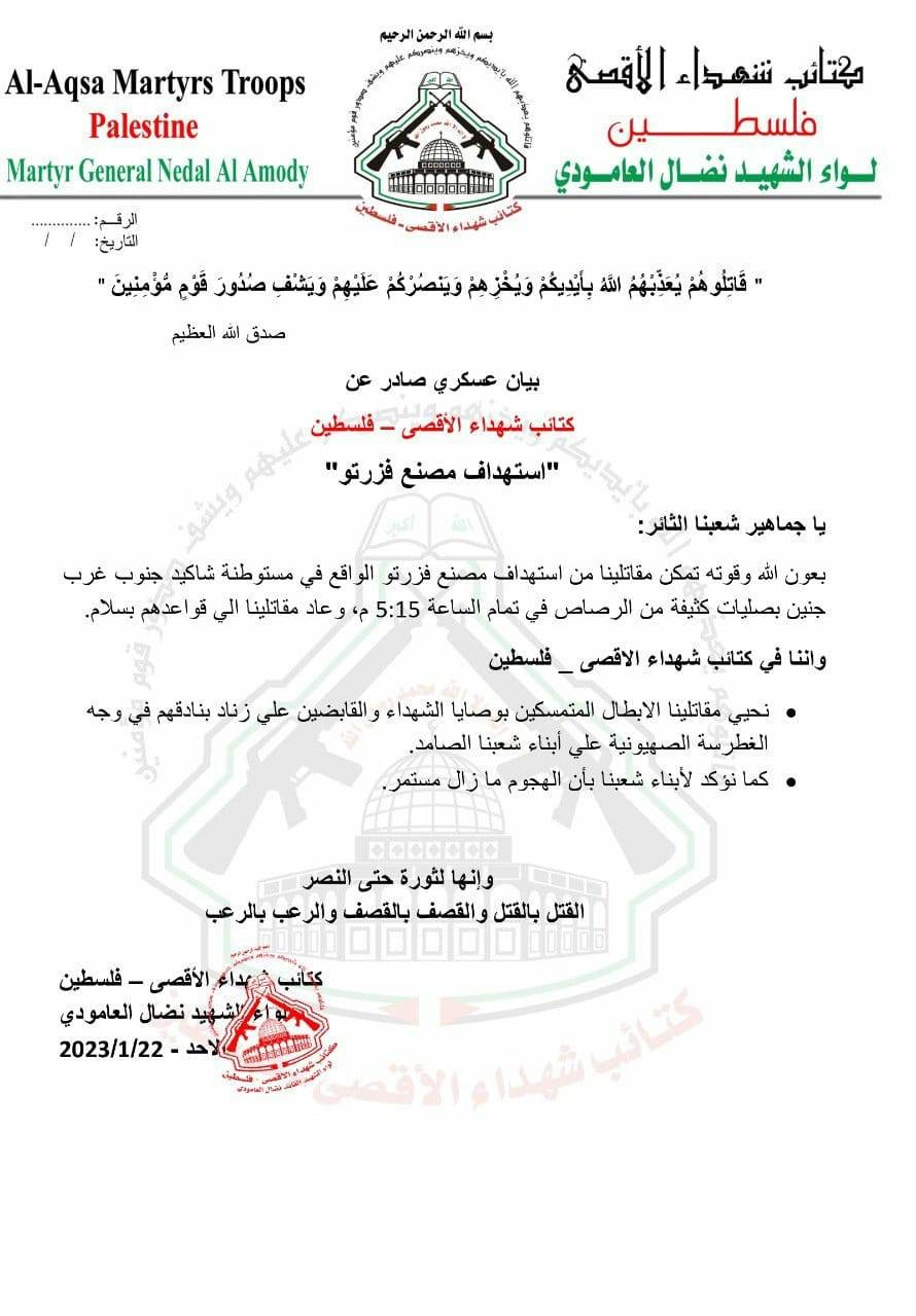 وقالت كتائب الأقصى "لواء العامودي" في بيان صحفي صحفي، "بعون الله وقوته، تمكن مقاتلينا من استهداف مصنع فزرتو الواقع في مستوطنة شاكيد جنوب غرب جنين بصليات كثيفة من الرصاص في تمام الساعة 5:15 م، وعاد مقاتلينا الي قواعدهم بسلام".