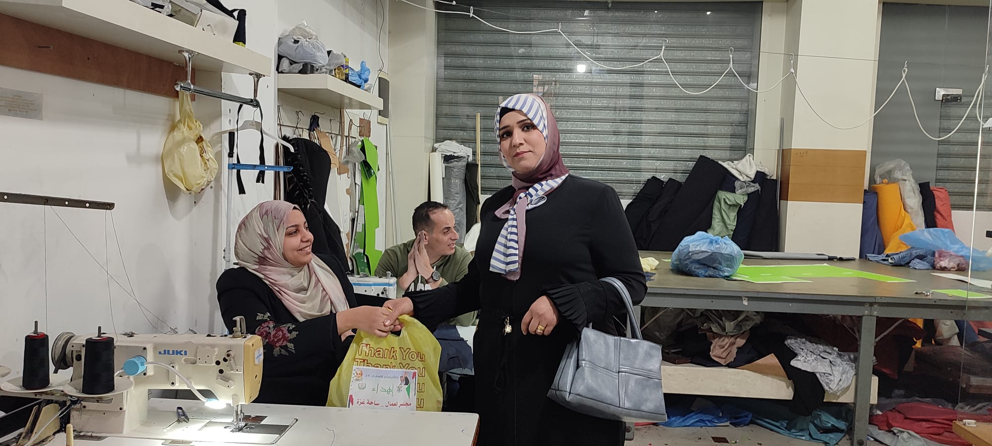 وفي نهاية الزيارة قام وفد المرأة العاملة بمحافظة غزة بتوزيع الهدايا الرمزية علي العاملات بمشغل الخياطة