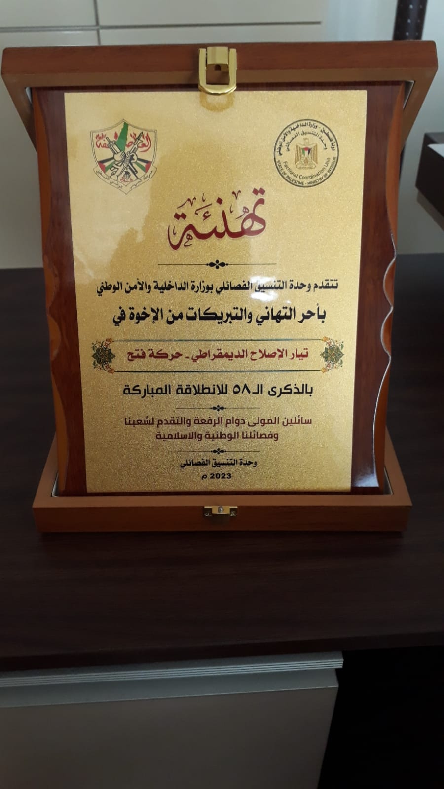 وفي نهاية اللقاء قام وفد الدائرة بتقديم درع التهنئة بمناسبة الانطلاقة ٥٨ لحركة فتح.