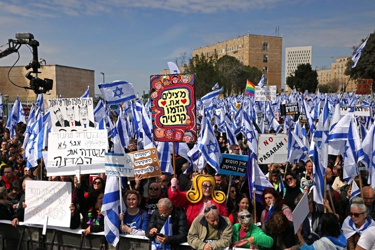 وصل نحو 15000 متظاهر إسرائيلي إلى شارع كابلان في القدس الغربية، بالقرب من مبنى الكنيست، حيث سيتم التصويت على خطة حكومية مثيرة للجدل لإصلاح القضاء.