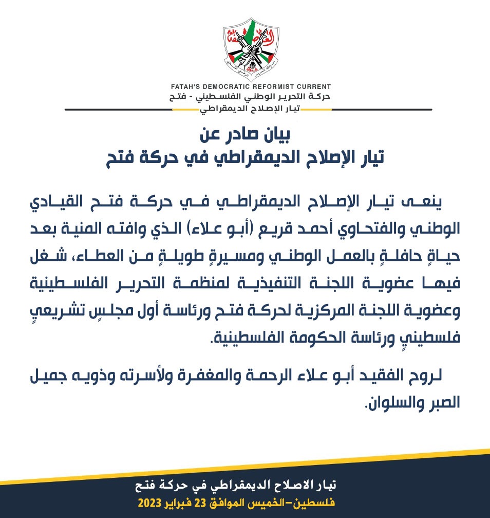 نعى تيار الإصلاح الديمقراطي في حركة فتح القيادي الوطني والفتحاوي أحمد قريع (أبو علاء)، الذي وافته المنية بعد حياةٍ حافلةٍ بالعمل الوطني ومسيرةٍ طويلةٍ من العطاء.