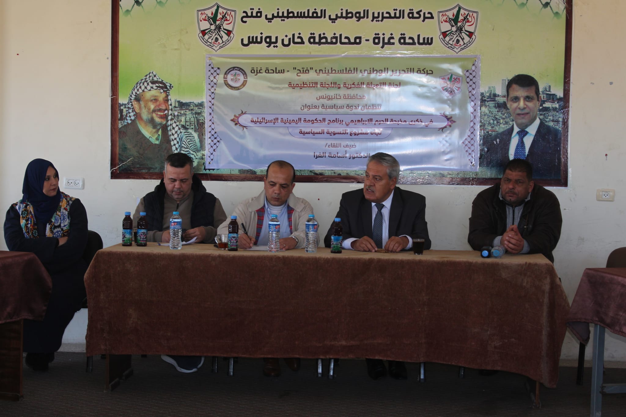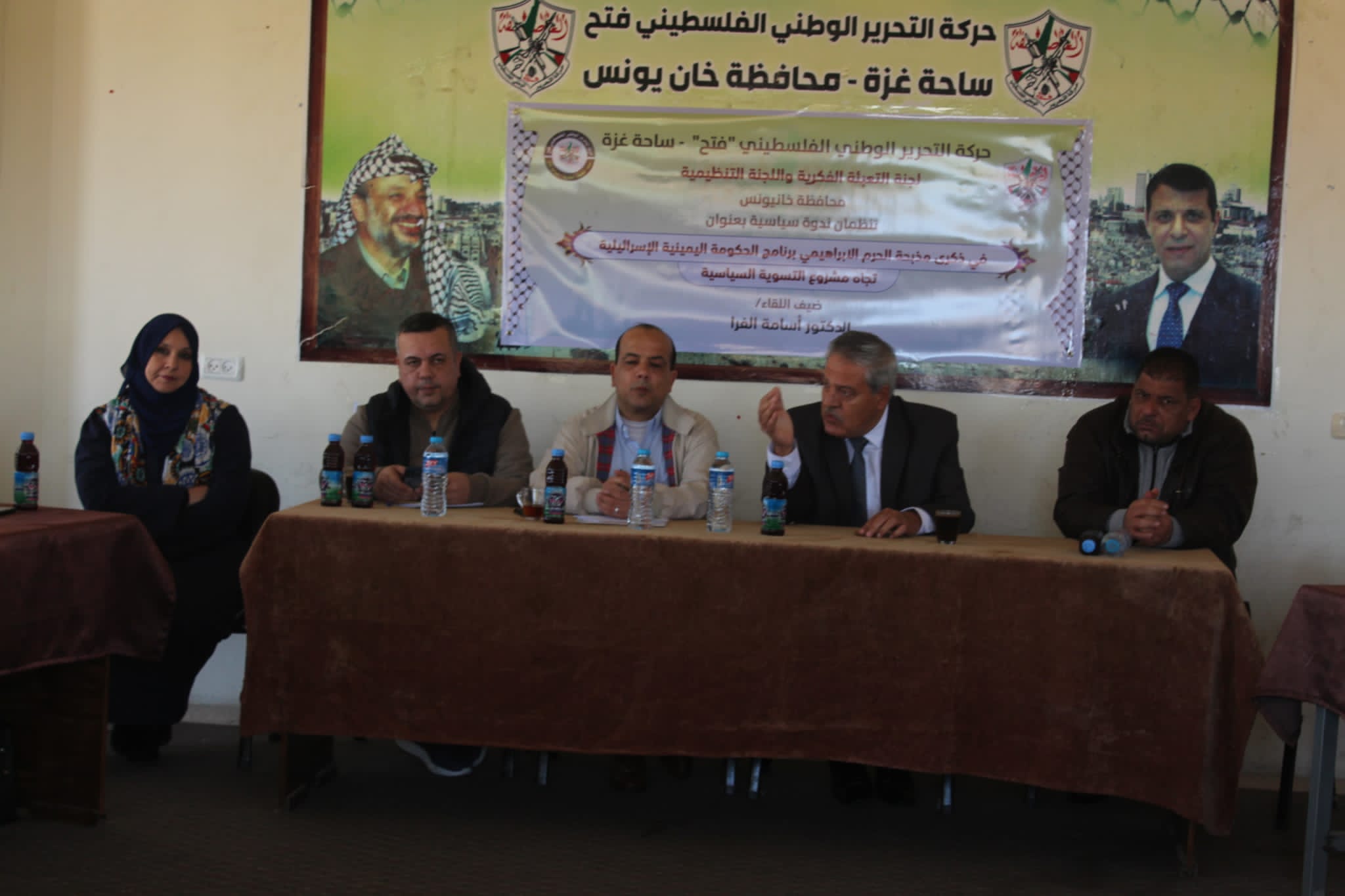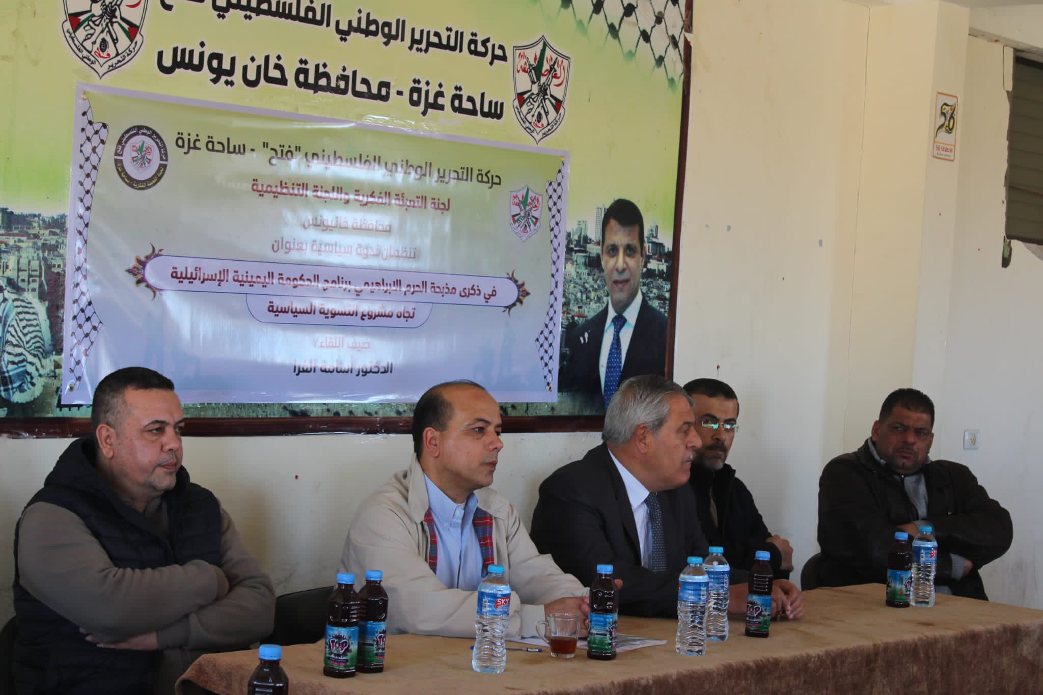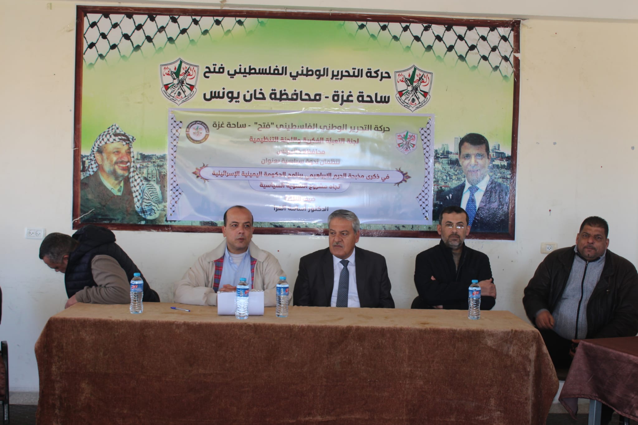 نظمت لجنتا التعبئة الفكرية واللجنة التنظيمية بمحافظة خانيونس في ذكرى مذبحة الحرم الإبراهيمي الشريف، ظهر اليوم السبت، ندوة سياسية بعنوان "في ذكرى مذبحة الحرم الابراهيمي.. برنامح الحكومة اليمينية الإسرائيلية تجاه مشروع التسوية السياسية" والتي استضافت فيها الدكتور أسامة الفرا القيادي البارز في تيار الإصلاح الديمقراطي بحركة فتح، واستهدفت مكونات العمل التنظيمي في المحافظة.