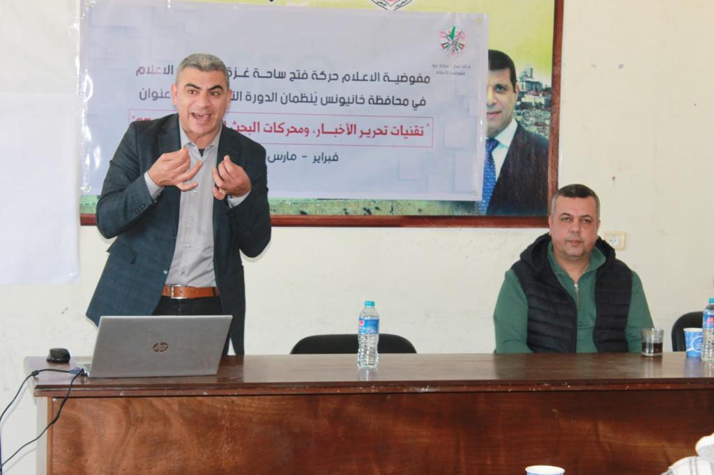 حيث أكد يوسف معمر أمين سر مجلس الاعلام في محافظة خانيونس، أن الدورة حضرها كوادر وأنصار من حركة فتح في محافظة خانيونس والتي كانت بواقع 30 ساعة تدريبية تتناول آلية تحرير الخبر ضمن العناصر الأساسية للخبر.