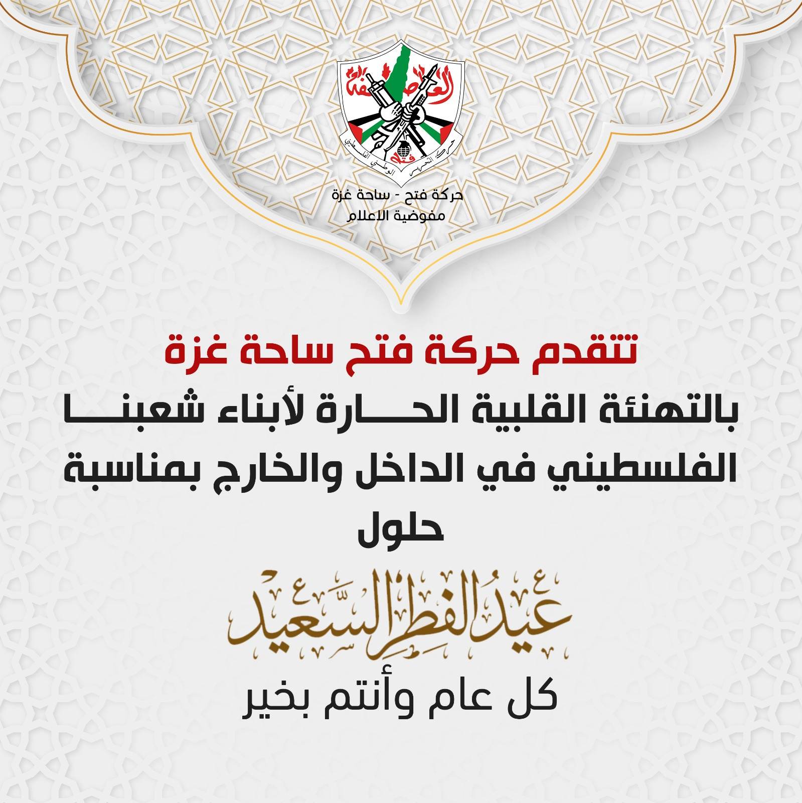 تتقدم حركة التحرير الوطني الفلسطيني فتح بساحة غزة، بأصدق التهاني والتبريكات من عموم أبناء شعبنا المناضل على امتداد تواجدهم في الداخل والخارج، ومن مكوناته الوطنية والمجتمعية بمناسبة حلول عيد الفطر السعيد.