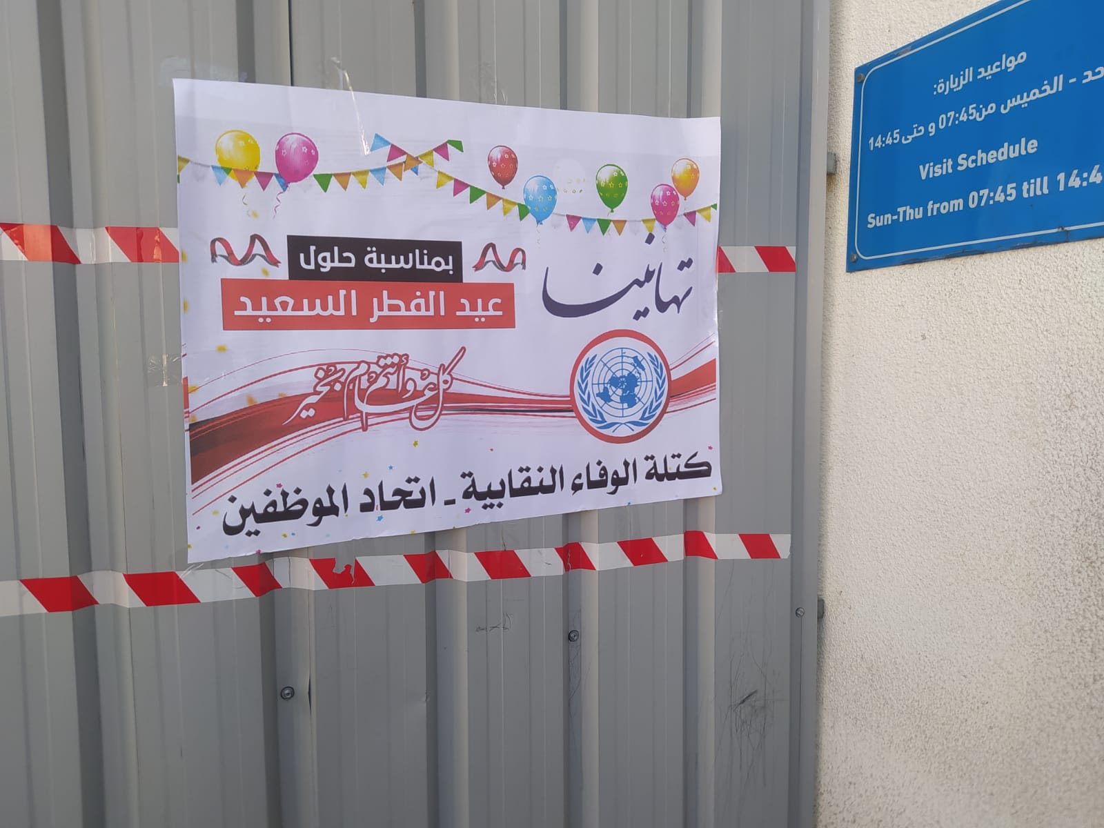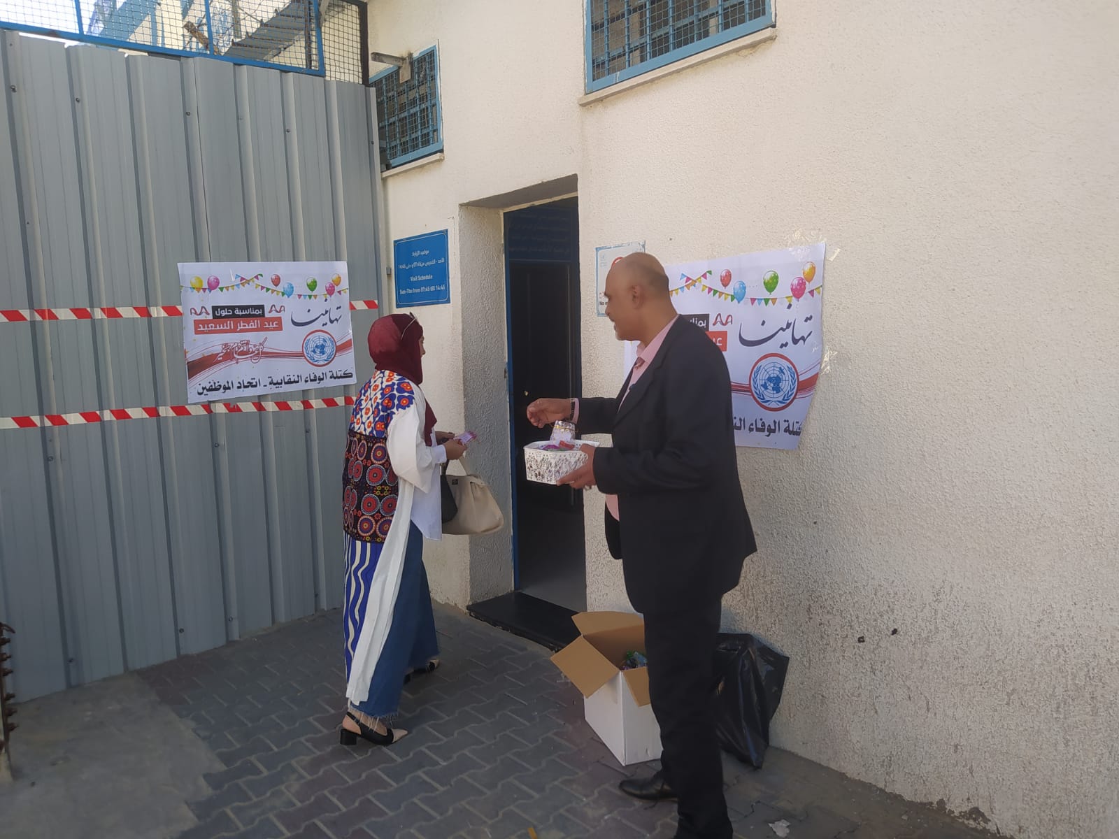 نفذت كتلة الوفاء النقابية استقبال معايدة عيد لموظفي الأونروا في المقر الرئيسي بغزة ،