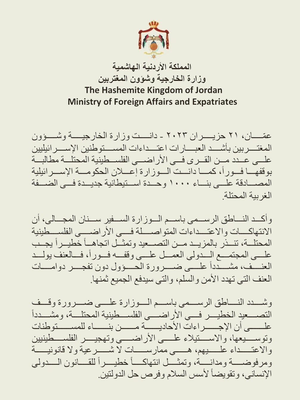 أدانت وزارة الخارجية الأردنية، اليوم الأربعاء، بأشد العبارات اعتداءات المستوطنين الإسرائيليين على عدد من القرى في الأراضي الفلسطينية المحتلة مطالبة بوقفها فوراً.