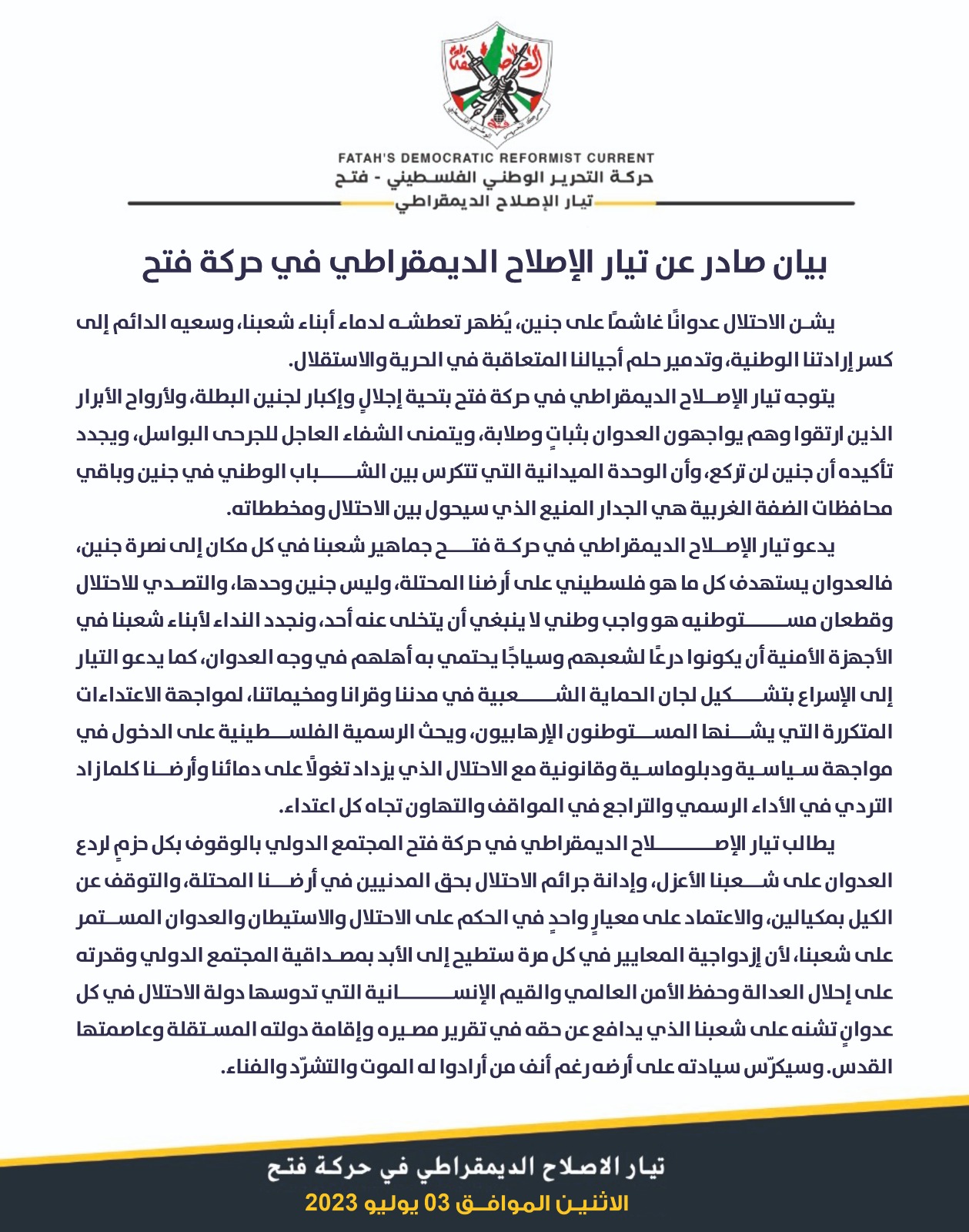 ودعا تيار الإصلاح الديمقراطي في حركة فتح جماهير شعبنا في كل مكان إلى نصرة جنين، لأن العدوان يستهدف كل ما هو فلسطيني على أرضنا المحتلة، وليس جنين وحدها.