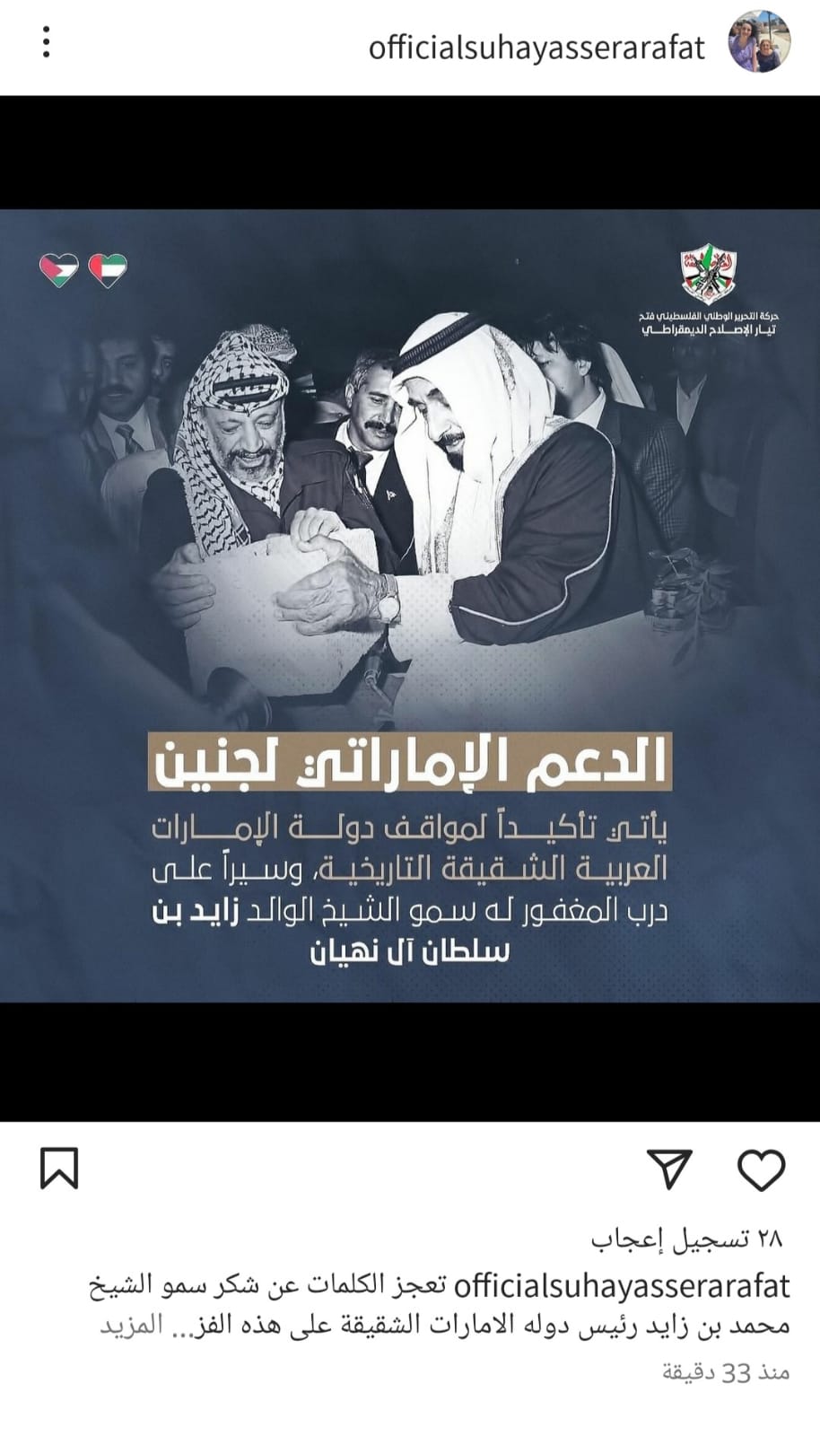 وقالت في منشور لها على "انستجرام":" تعجز الكلمات عن شكر سمو الشيخ محمد بن زايد رئيس دوله الإمارات الشقيقة على هذه الفزعة لمخيم جنين الباسل وعلى ارسال المساعدات الماليه الضخمه لبناء المخيم من جديد".