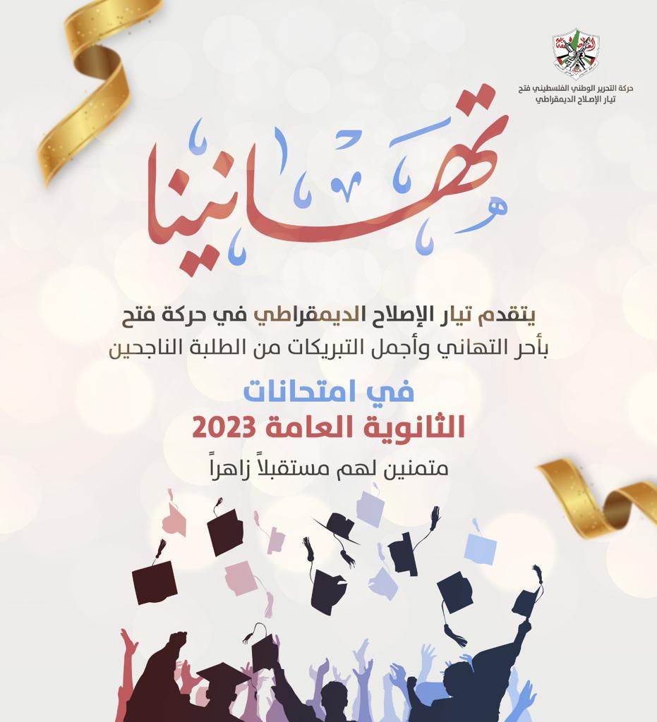يتقدم تيار الإصلاح الديمقراطي في حركة فتح، بأجمل التهاني والتبريكات من عموم طلبة الثانوية العامة الناجحين لهذا العام في كافة محافظات الوطن، وخاصة أبناء الشهداء والأسرى.