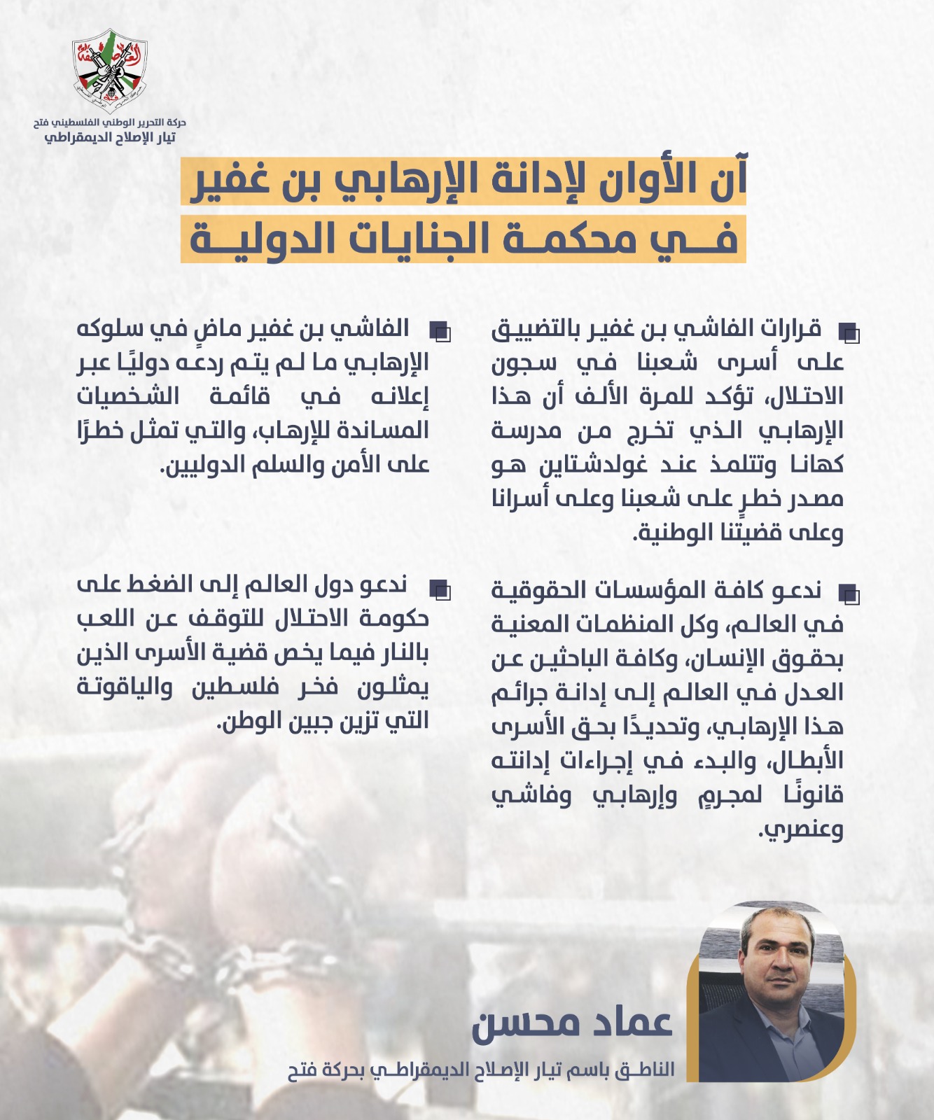 قال الناطق باسم تيار الإصلاح الديمقراطي بحركة فتح، عماد محسن، إن قرارات الفاشي بن غفير بالتضييق على أسرى شعبنا في سجون الاحتلال، تؤكد للمرة الألف أن هذا الإرهابي الذي تخرج من مدرسة كهانا وتتلمذ عند غولدشتاين هو مصدر خطرٍ على شعبنا وعلى أسرانا وعلى قضيتنا الوطنية.