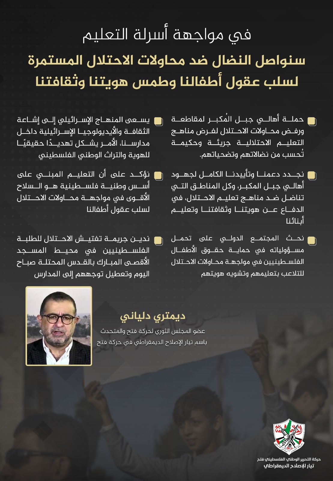 قال عضو المجلس الثوري والمتحدث باسم تيار الاصلاح الديمقراطي في حركة فتح، ديمتري دلياني، إن حملة أهالي جبل الُمكبر لمقاطعة ورفض محاولات الاحتلال لفرض مناهج التعليم الاحتلالية على أطفالنا بخلاف القانون الدولي هي حملة جريئة وحكيمة تُحسب من نضالات وتضحيات أهالي جبل المكبر الوطنية، حيث تأتي هذه الحملة الحقة على أسس أن منهاج التعليم الاحتلالي الإسرائيلي يسعى إلى إشاعة الثقافة والأيديولوجيا الإسرائيلية داخل مدارسنا، الأمر يشكل تهديدًا حقيقيًا للهوية والتراث الوطني الفلسطيني ومحاولة لسلب عقول اطفالنا.