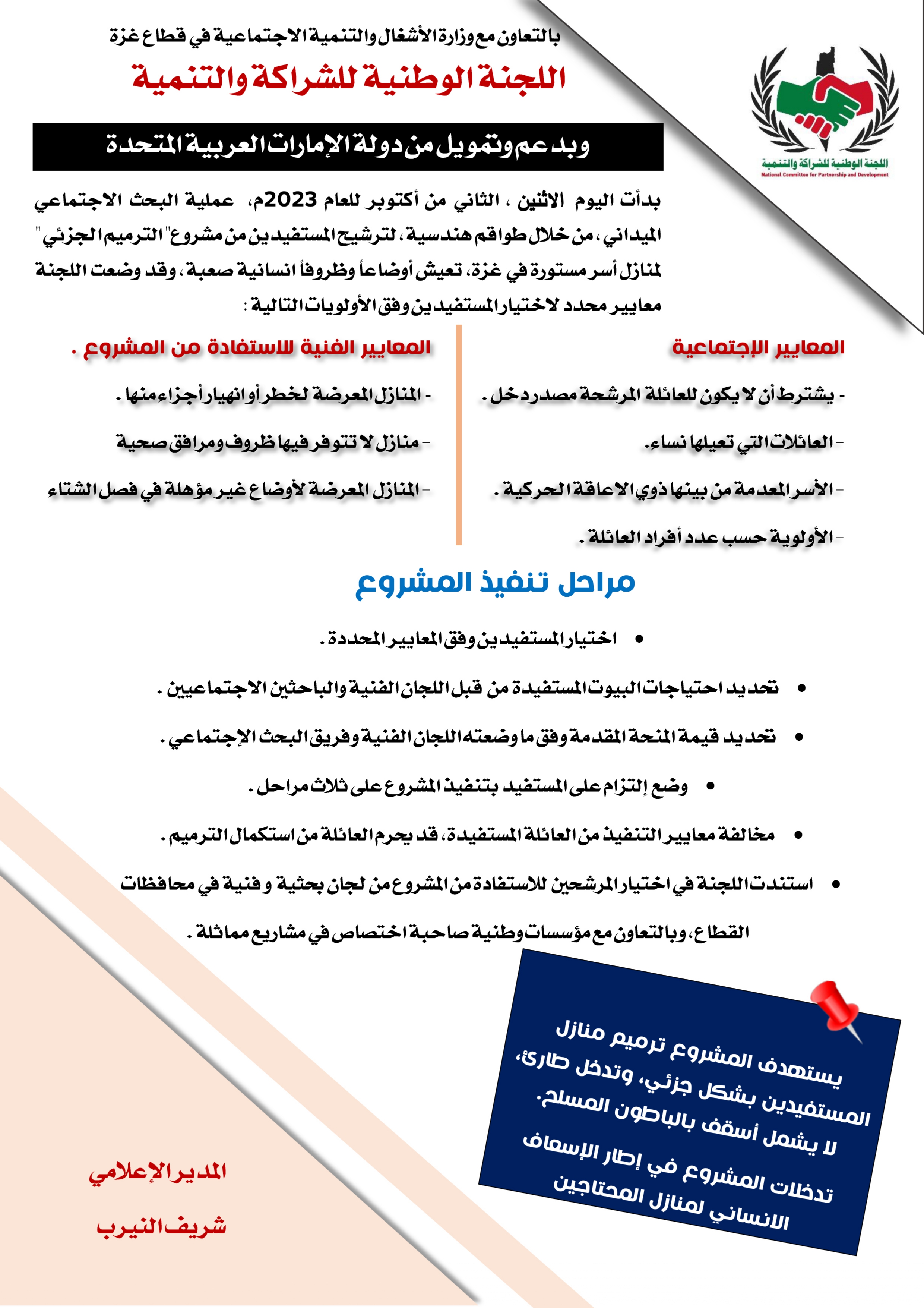 وأكد المدير الإعلامي للجنة الوطنية للشراكة والتنمية، شريف النيرب، أن المشروع بدعم وتمويل من دولة الإمارات العربية المتحدة، ويتم اختيار المستفيدين وفق معايير اجتماعية وفنية.