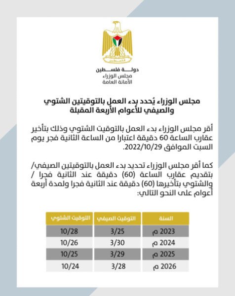 يُشار إلى أن مجلس الوزراء اعتمد العام الماضي مواعيد التوقيتات الصيفية والشتوية، في فلسطين، خلال أربع سنوات مقبلة.