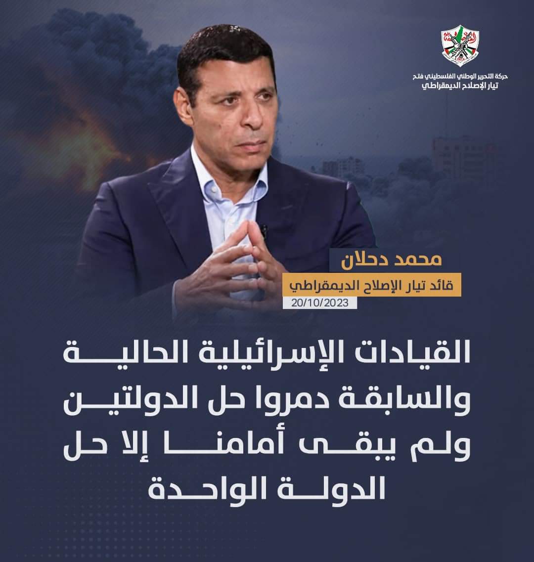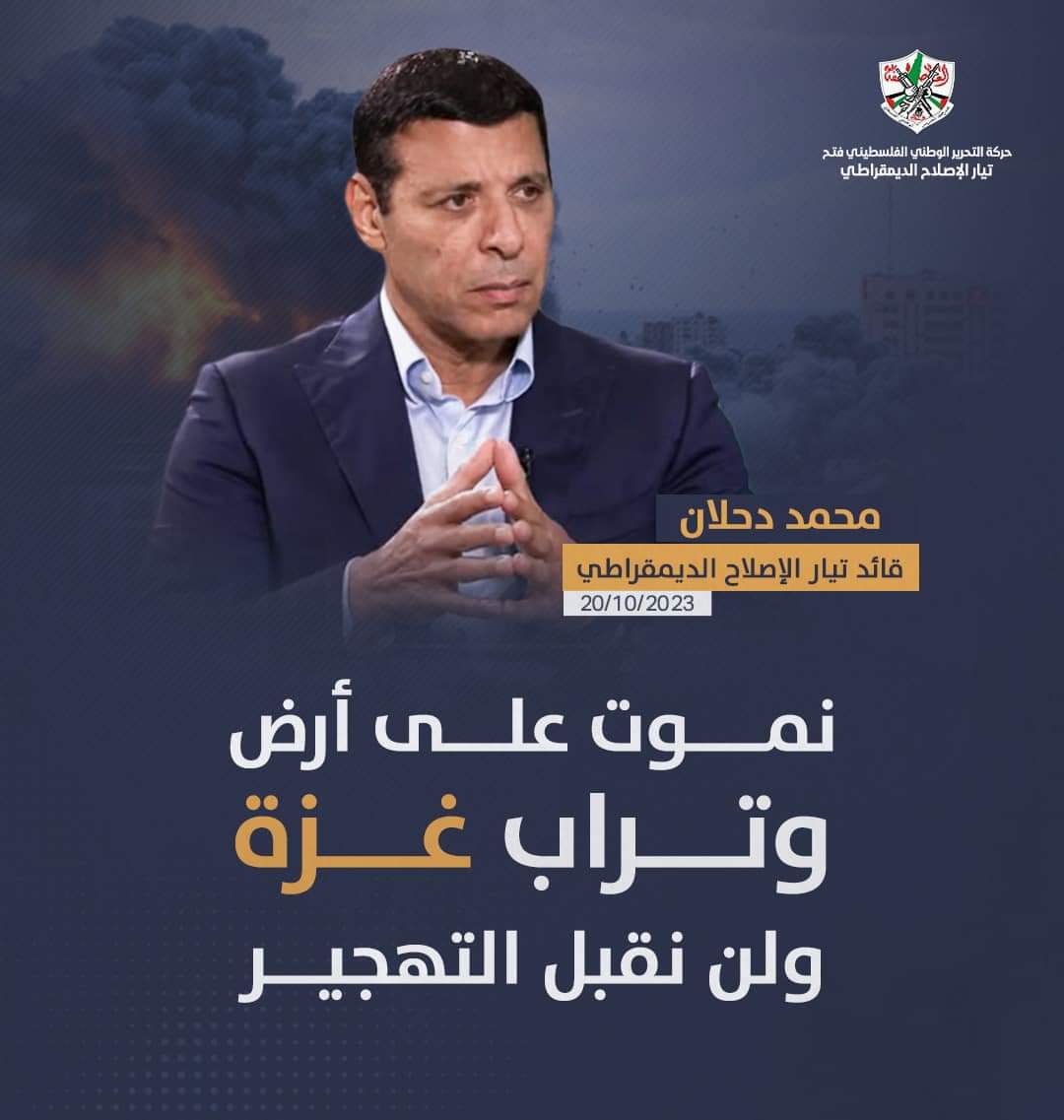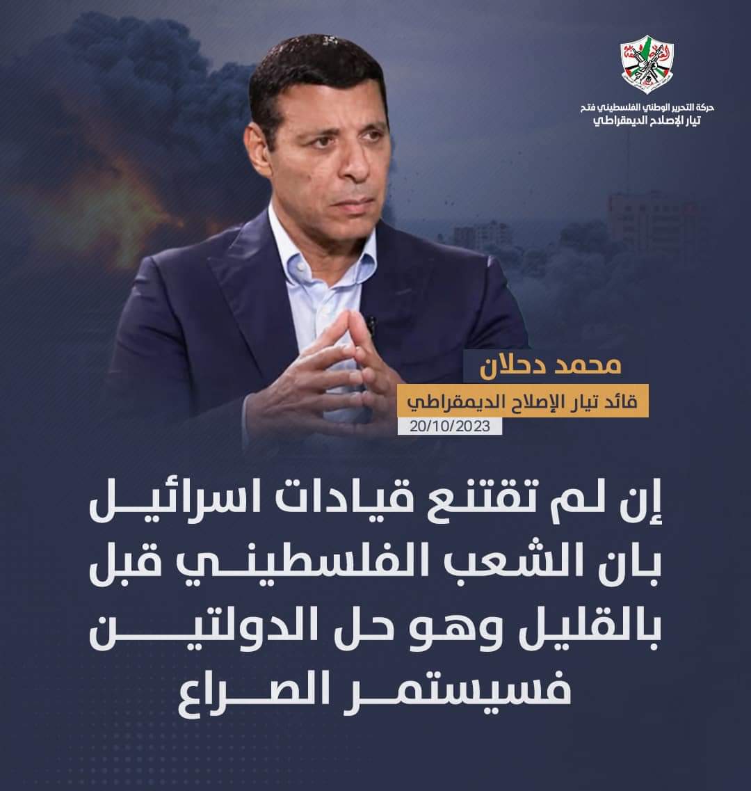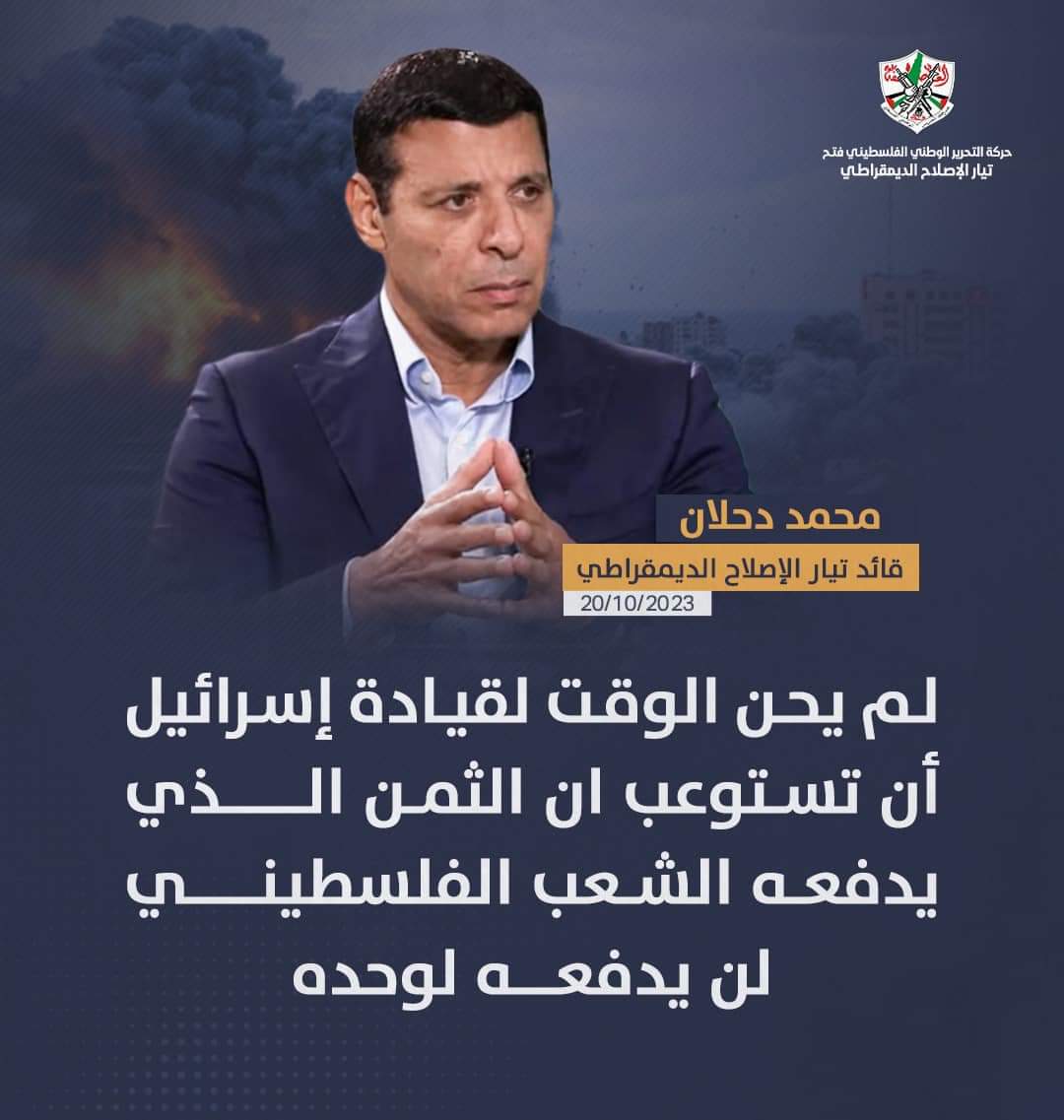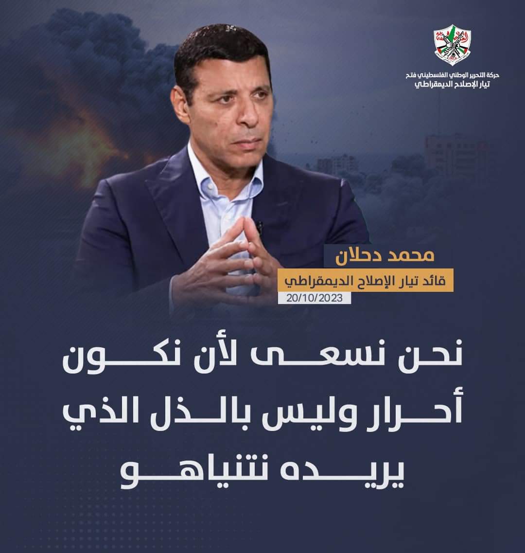 أكد قائد تيار الإصلاح الديمقراطي في حركة فتح محمد دحلان، أن الشعب الفلسطيني يفاجئ اسرائيل بموقفه المبني على الصمود والتحدي، وأنه لن يَقبل بالتهجير، وأن شعبنا قَبِل بالقليل وهو حل الدولتين لأنه يريد العيش بحرية واستقلال.
