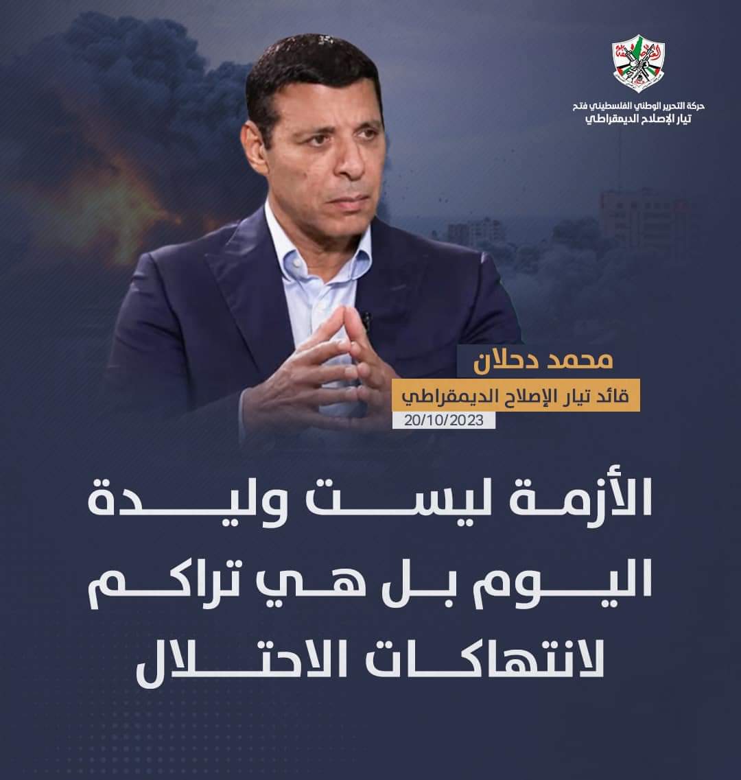 وأكد دحلان أن اسرائيل في حالة ارباك سياسي وحزبي ومصالح شخصياتها السياسية، لا تبحث عن حلول مع الشعب الفلسطيني، ونحن نُدرك ونعرف أن الاجراءات الاسرائيلية تُراكم الضغط، وأن شعبنا الفلسطيني لن يترك أرضه ولن يرحل.
