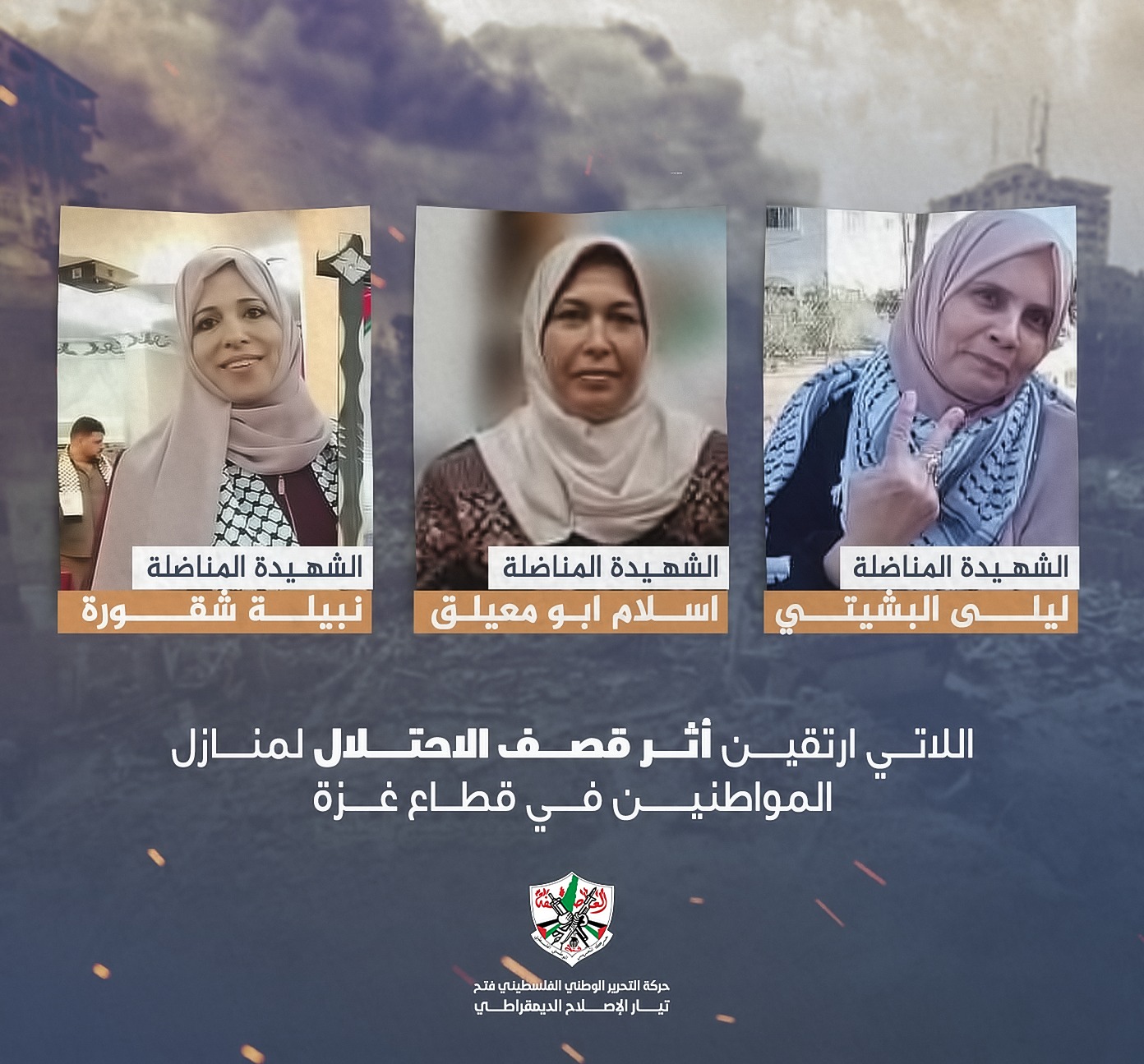 نعى تيار الإصلاح الديمقراطي في حركة فتح بكل فخرٍ واعتزاز الشهيدة المناضلة نبيلة شقورة عضو مجلس ساحة غزة.