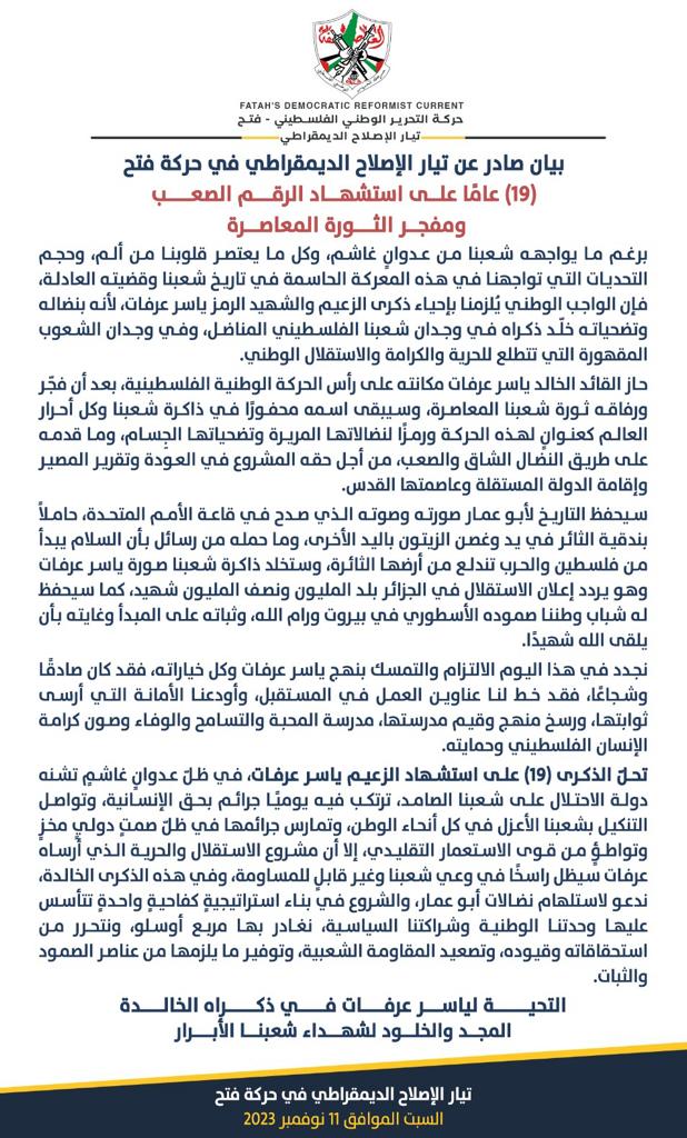 تيار الإصلاح الديمقراطي : رغم جرائم الاحتلال، إلا أن مشروع الاستقلال والحرية الذي أرساه عرفات سيظل راسخاً في وعي شعبنا وغير قابلٍ للمساومة