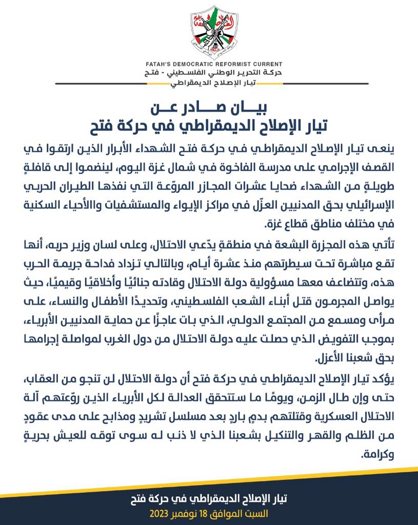 نعى تيار الإصلاح الديمقراطي في حركة فتح، الشهداء الأبرار الذين ارتقوا في القصف الإجرامي على مدرسة الفاخورة في شمال غزة اليوم، لينضموا إلى قافلةٍ طويلةٍ من الشهداء ضحايا عشرات المجازر المروّعة التي نفذها الطيران الحربي الإسرائيلي بحق المدنيين العزّل في مراكز الإيواء والمستشفيات واالأحياء السكنية في مختلف مناطق قطاع غزة.