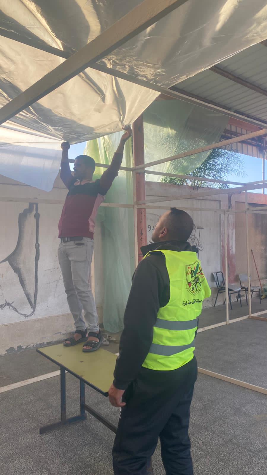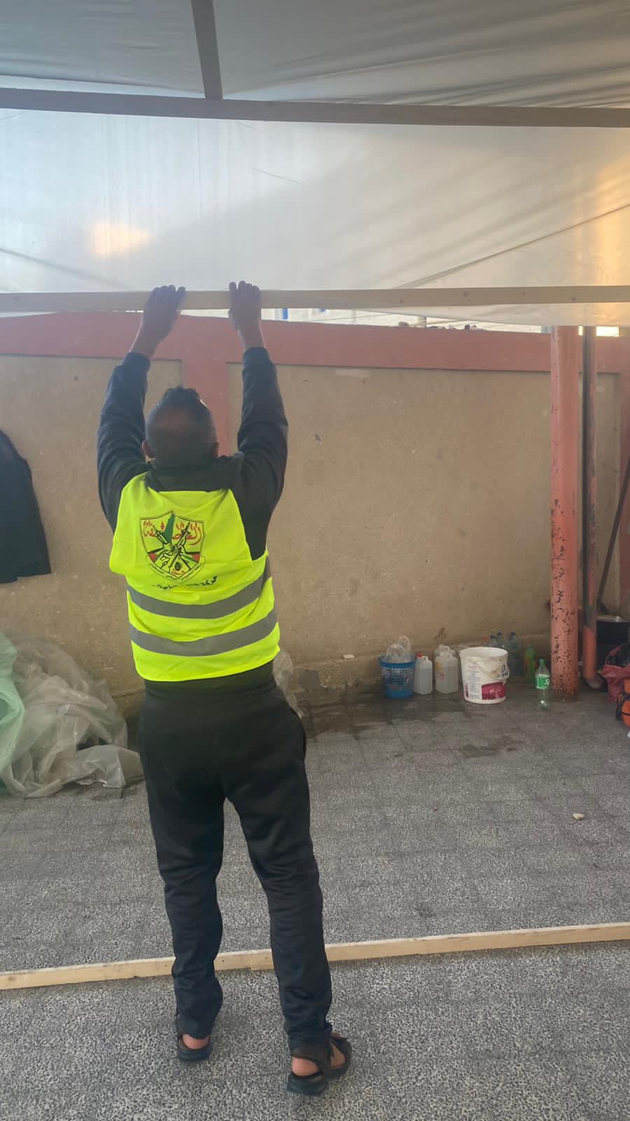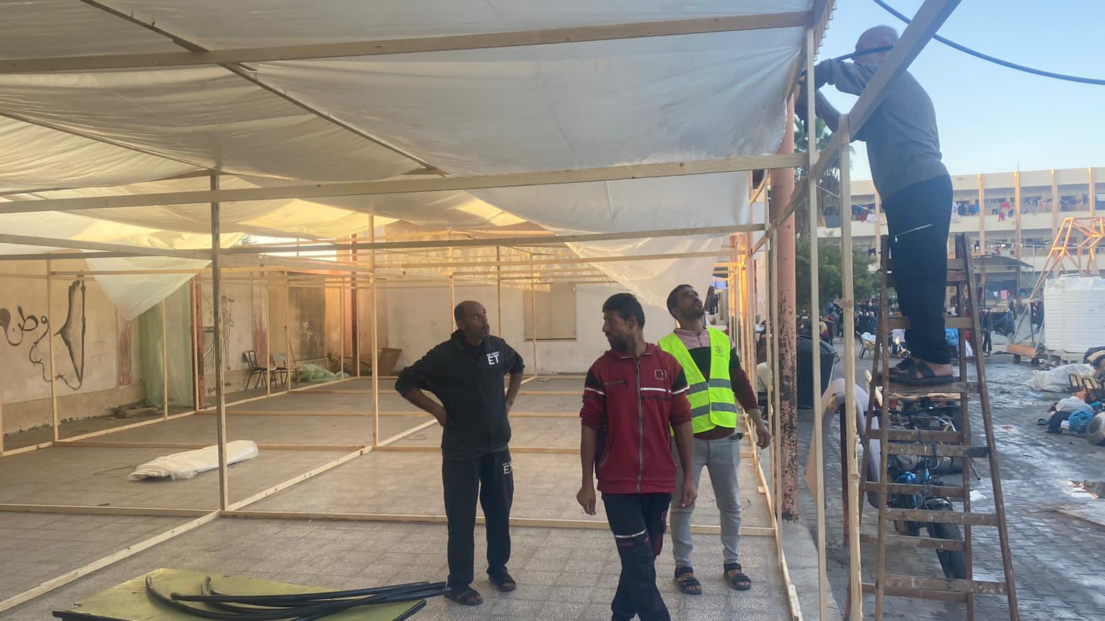 تيار الإصلاح الديمقراطي في حركة فتح يشيد خيام داخل مراكز الايواء للنازحين في محافظة خانيونس