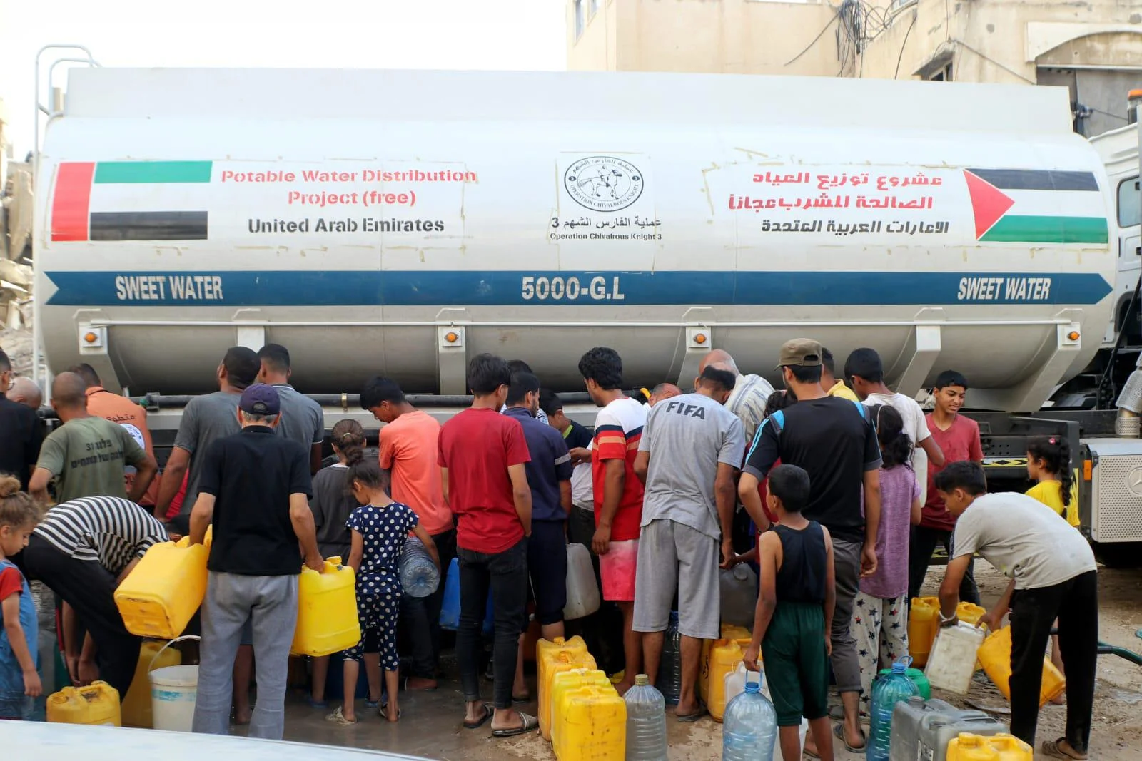 وتُقدم عملية الفارس الشهم 3 المياه الصالحة للشرب للنازحين في مراكز الإيواء، في إطار المبادرات الإنسانية والخدمات الأساسية التي تُقدمها دولة الإمارات، لمساندة النازحين في ظل الأحداث المؤسفة، حيث تعمل في كل مكان زمان على دعم الأسر الفلسطينية.