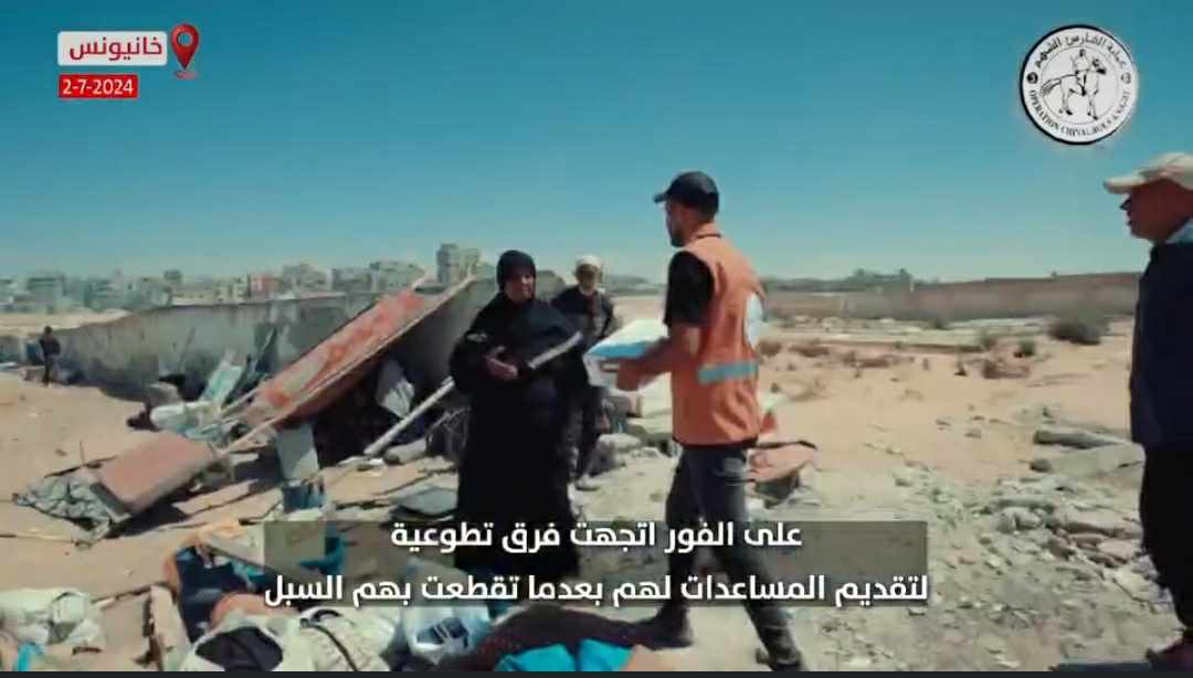 هب متطوعو عملية (الفارس الشهم 3) على الفور لتقديم المساعدة للمواطنين النازحين من شرق مدينة خان يونس الذين تقطعت بهم السبل، وأمضوا ليلتهم في الشارع، بعد أن أعلن جيش الاحتلال الإسرائيلي بضرورة اخلاء تلك المناطق، متجهين إلى منطقة المواصي بحثاً عن الأمن المفقود.