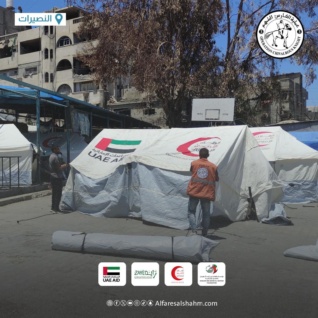 وقدمت عملية (الفارس الشهم 3) خيام إيواء للنازحين في مدرسة بالنصيرات وسط قطاع غزة، لمساندة العائلات بعد حرق وتدمير خيامهم خلال الأيام الماضية في قصف على المدرسة.