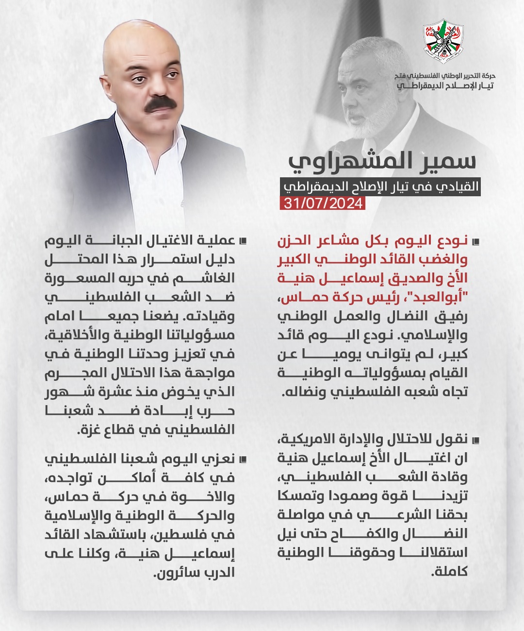 قال القائد سمير المشهراوي، نودع اليوم بكل مشاعر الحزن والغضب القائد الوطني الكبير الأخ والصديق إسماعيل هنية "أبوالعبد"، رئيس حركة حماس، رفيق النضال والعمل الوطني والإسلامي.