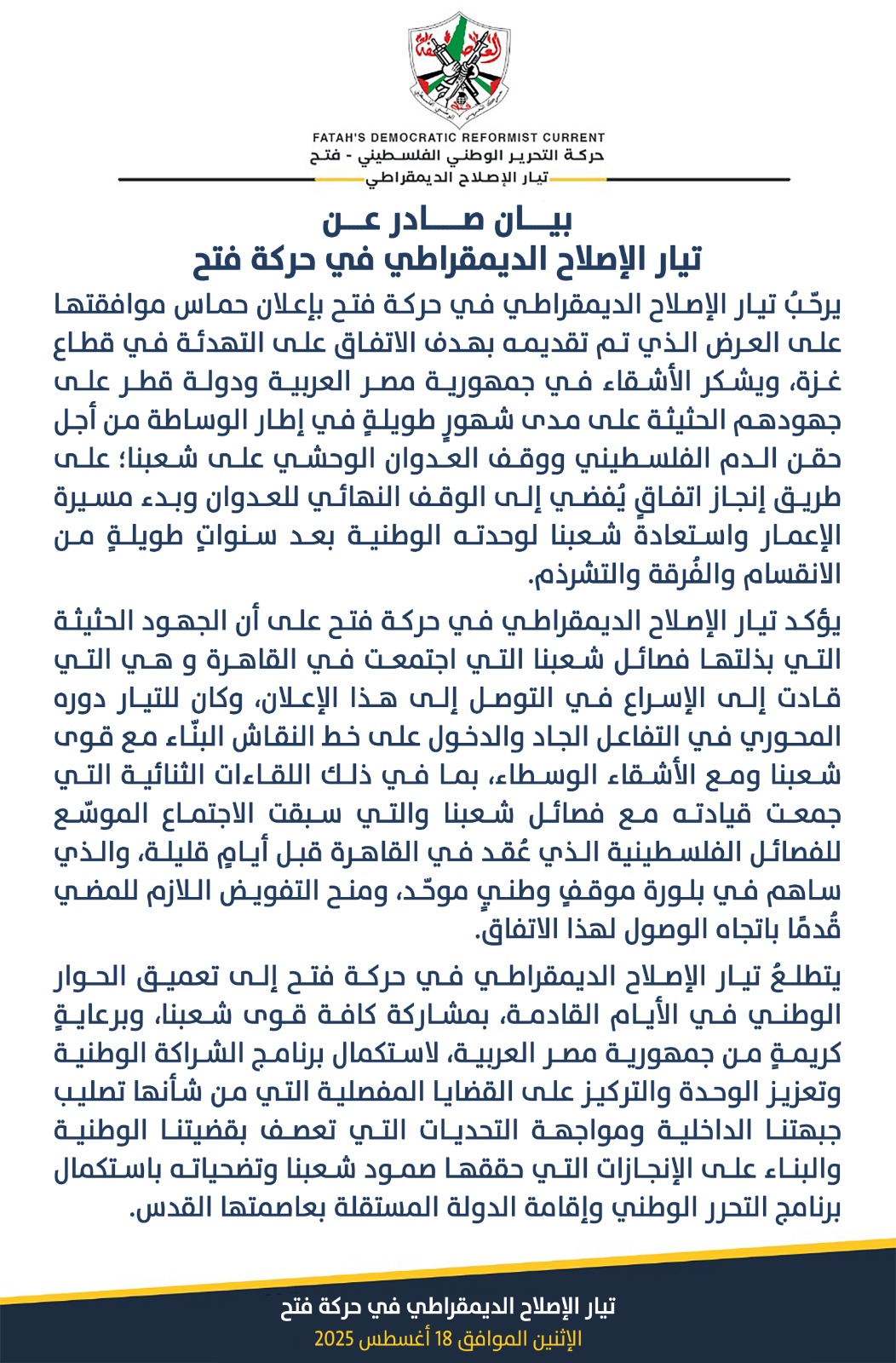 رحّب تيار الإصلاح الديمقراطي في حركة فتح بإعلان حركة حماس موافقتها على العرض المقدم من الوسطاء بشأن التهدئة في قطاع غزة، ويعرب عن تقديره الكبير للجهود المتواصلة التي بذلتها الشقيقة مصر ودولة قطر على امتداد الشهور الماضية من أجل وقف نزيف الدم الفلسطيني ورفع المعاناة عن شعبنا، وصولًا إلى اتفاق شامل يضع حدًا للعدوان، ويمهّد لمرحلة الإعمار واستعادة الوحدة الوطنية بعد سنوات الانقسام والتشرذم.