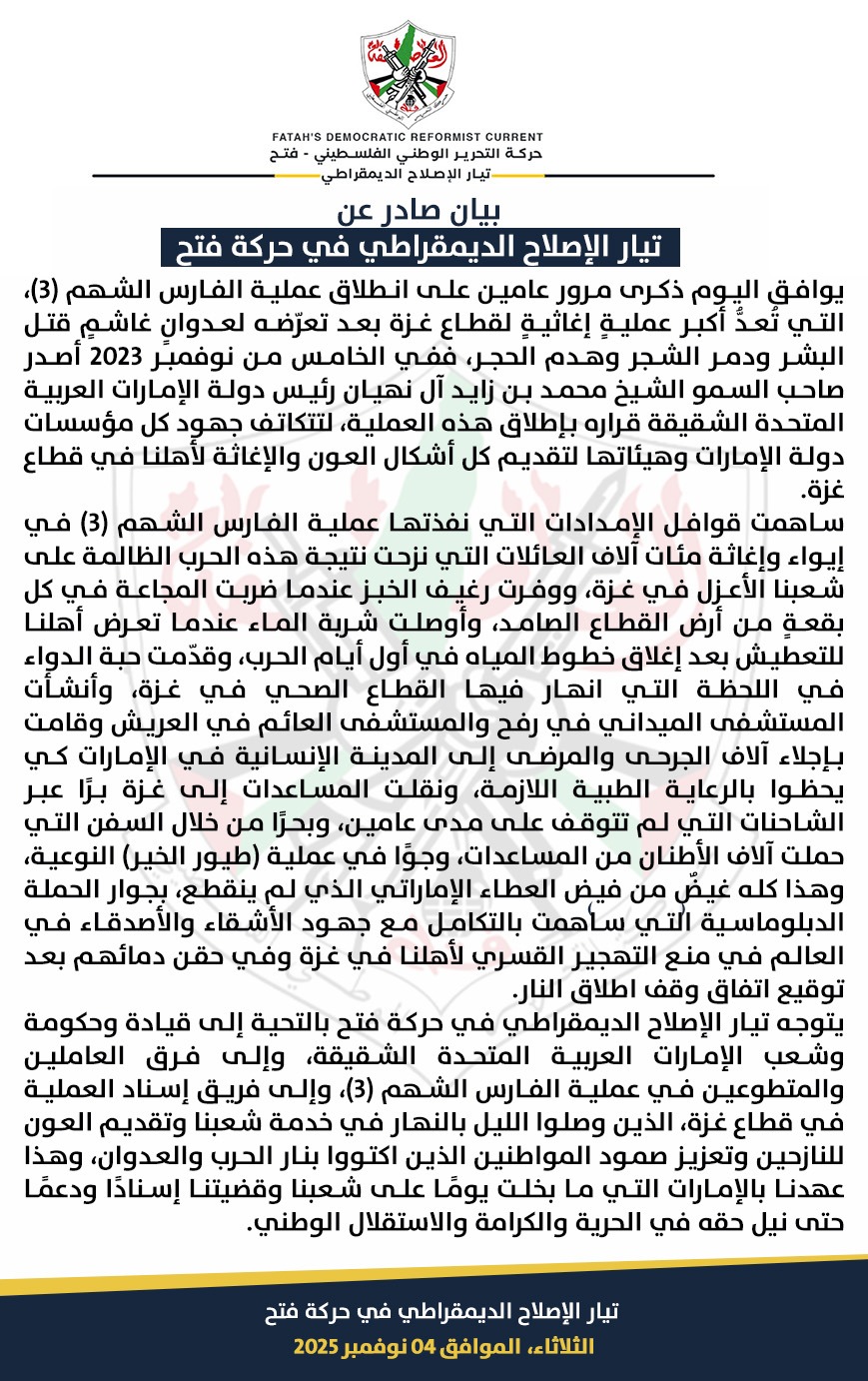 وأضاف التيار في بيان له: "أن قوافل الإمدادات التي نفذتها عملية الفارس الشهم (3) وفرت رغيف الخبز عندما ضربت المجاعة في كل بقعةٍ من أرض القطاع الصامد، وأوصلت شربة الماء عندما تعرض أهلنا للتعطيش بعد إغلاق خطوط المياه في أول أيام الحرب، وقدّمت حبة الدواء في اللحظة التي انهار فيها القطاع الصحي في غزة، وأنشأت المستشفى الميداني في رفح والمستشفى العائم في العريش وقامت بإجلاء آلاف الجرحى والمرضى إلى المدينة الإنسانية في الإمارات كي يحظوا بالرعاية الطبية اللازمة، ونقلت المساعدات إلى غزة برًا عبر الشاحنات التي لم تتوقف على مدى عامين، وبحرًا من خلال السفن التي حملت آلاف الأطنان من المساعدات، وجوًا في عملية (طيور الخير) النوعية، وهذا كله غيضٌ من فيض العطاء الإماراتي الذي لم ينقطع، بجوار الحملة الدبلوماسية التي ساهمت بالتكامل مع جهود الأشقاء والأصدقاء في العالم في منع التهجير القسري لأهلنا في غزة وفي حقن دمائهم بعد توقيع اتفاق وقف اطلاق النار".